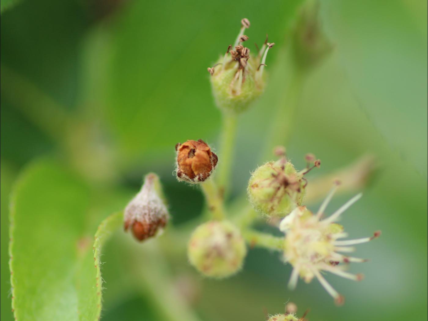 Description: Boutons floraux desséchés à la suite de la nutrition de punaises ternes. La piqûre de nutrition de la punaise terne sur un bouton floral provoque parfois l’apparition d’une goutte de sève appelée exsudat. Les piqûres de punaises ternes adultes entraînent l’avortement et le dessèchement des boutons floraux et donc une baisse de production fruitière.