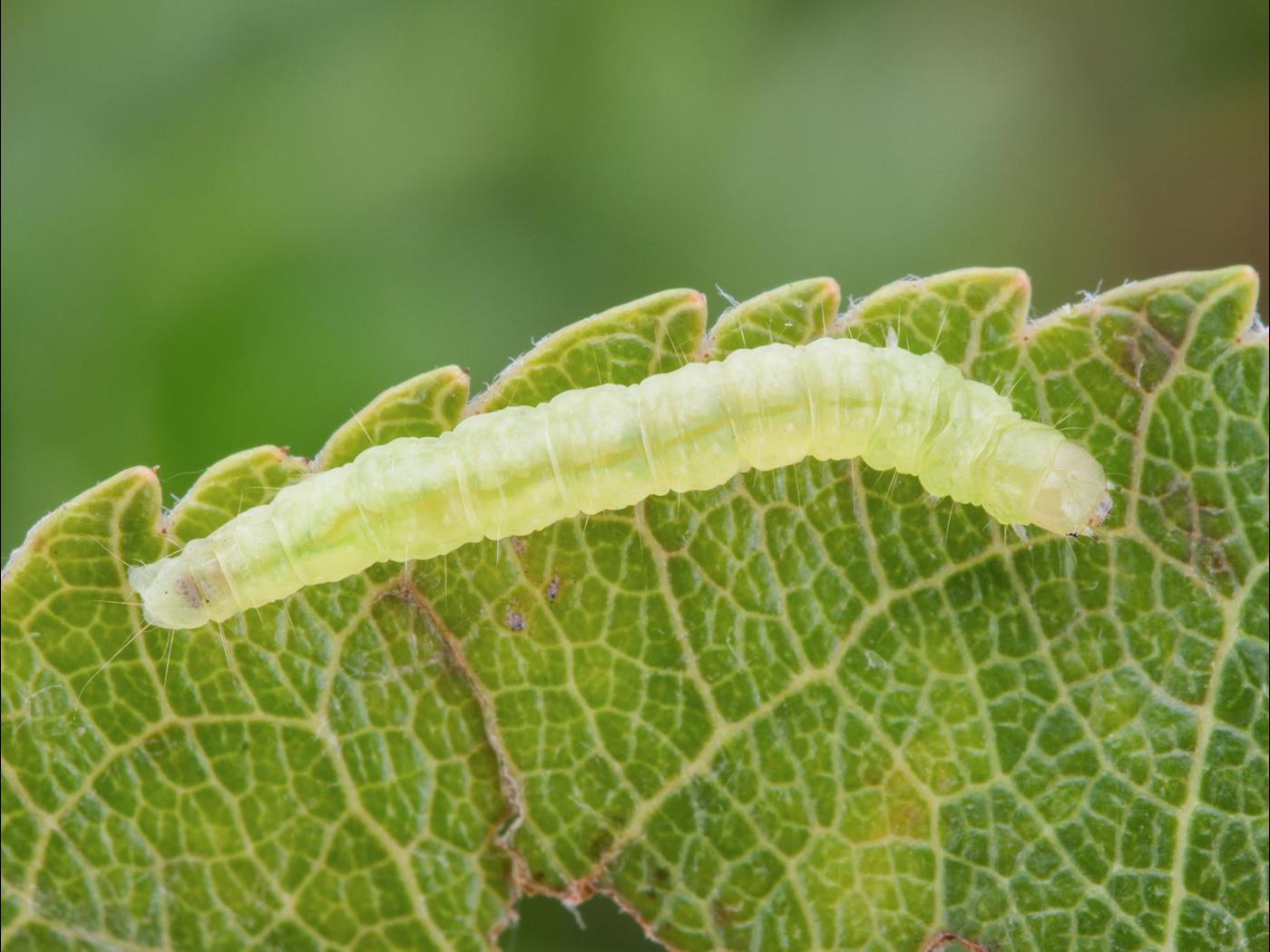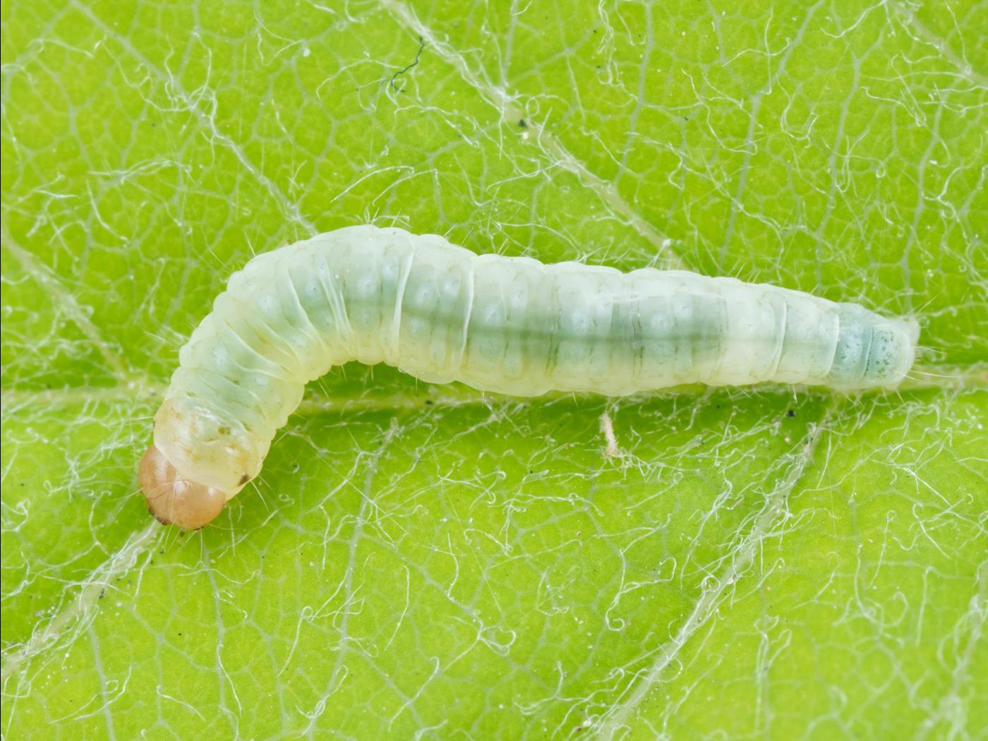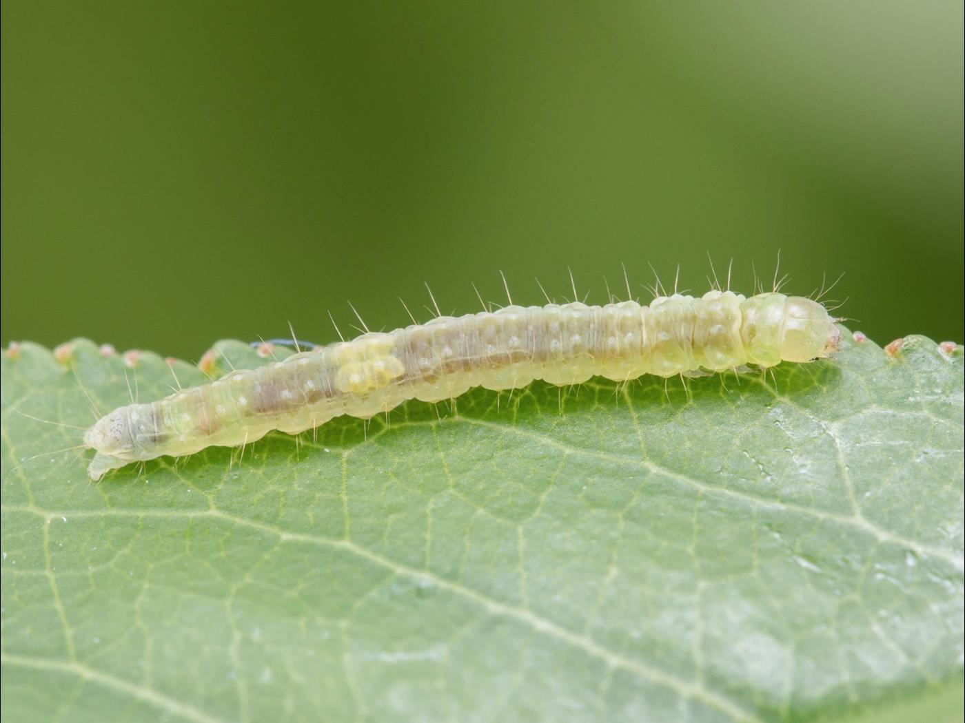 Larve: 15,0 à 17,0 mm; le corps est vert pâle ou légèrement jaunâtre; la tête est verdâtre lorsque la larve est jeune et elle devient brun pâle par la suite.