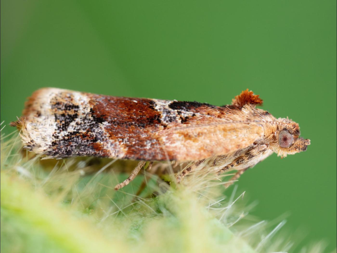 Adulte : envergure des ailes de 12,0 à 16,0 mm; le corps est gris-brun; la coloration des ailes antérieurs est assez variable, elles sont généralement grises ou brunâtres et ornées d’une bande oblique brun foncé nuancée de rouge.