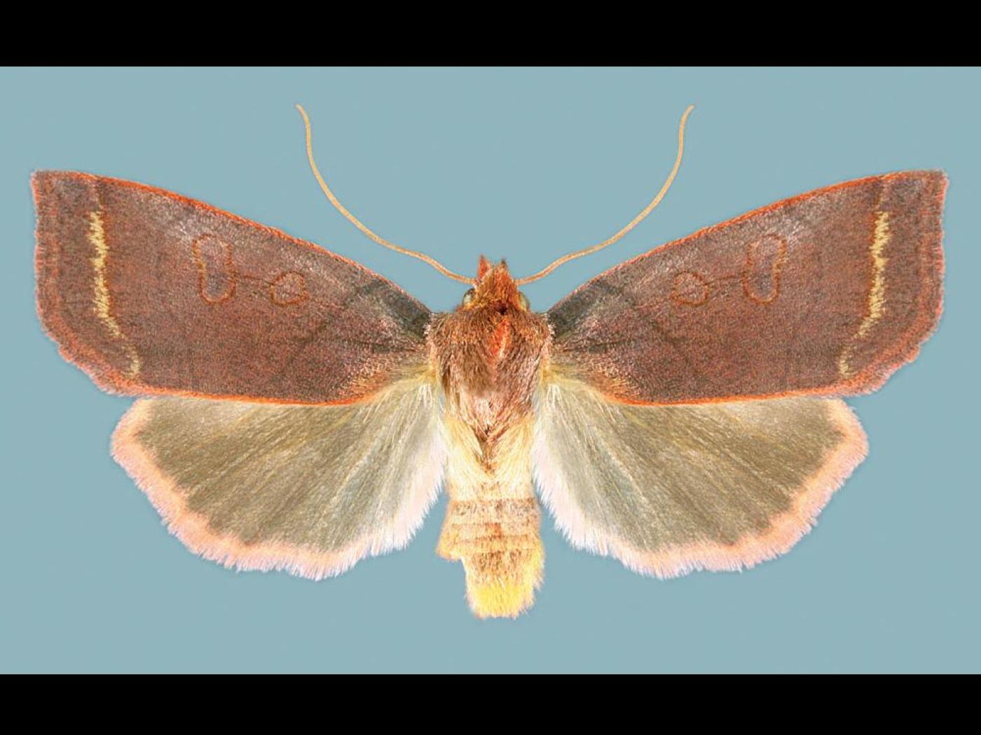 Adulte : envergure des ailes de 38,0 mm; les ailes antérieures sont brun rouge et traversées par une ligne submarginale jaune; les ailes postérieures sont grisâtres et possèdent une frange rosée.