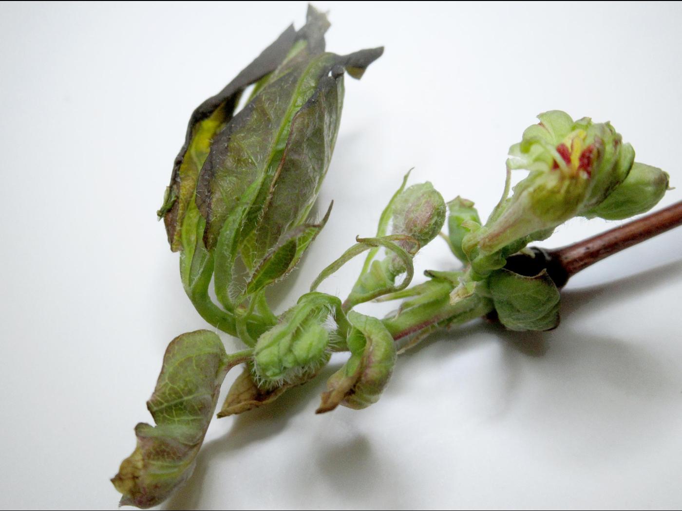 Description: Jeunes tissus nécrosés suite au gel printanier. La présence de Pseudomonas syringae a accrue la sensibilité des bourgeons au gel.