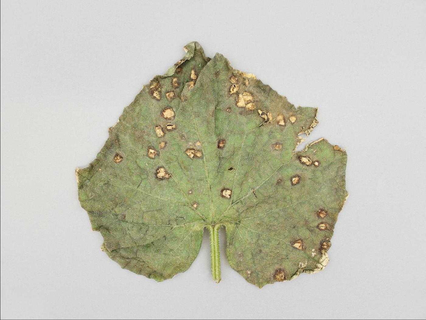 Description: À la face supérieure d’une feuille de concombre de champ, présence de nombreuses taches blanches à beiges, circulaires à légèrement angulaires, délimitées par une marge foncée. Leur dimension varie entre 1 et 5 mm. Ces taches peuvent se regrouper pour former de grandes plages brulées. Des déchirures importantes du limbe sont visibles. Les tests de laboratoire ont révélé la présence du champignon Alternaria alternata, responsable de la tache alternarienne des feuilles.