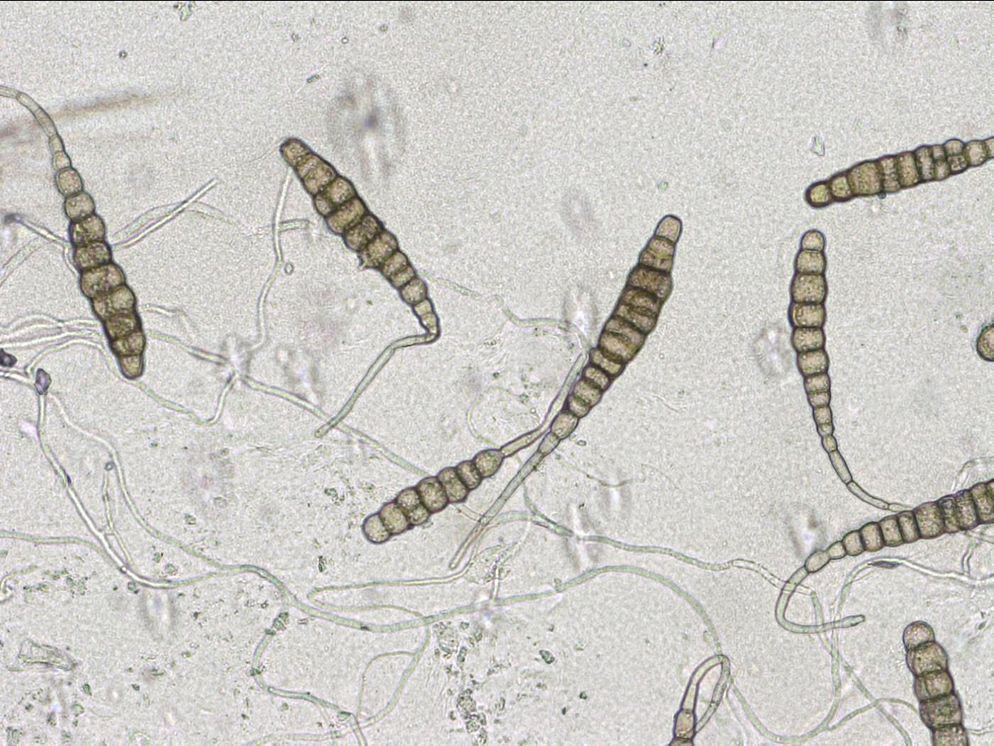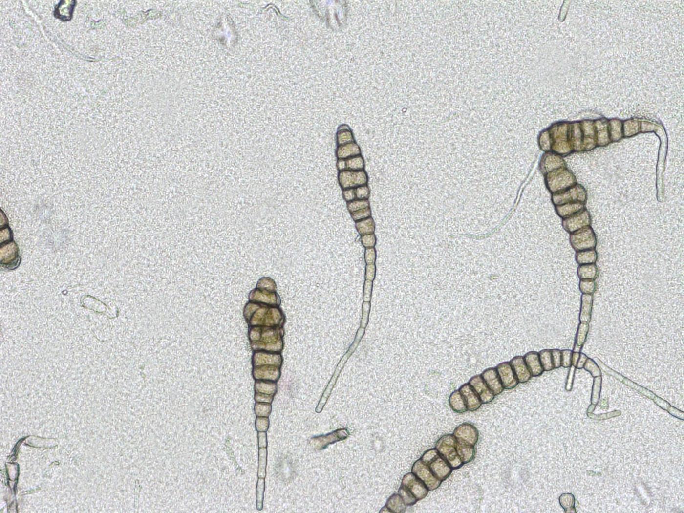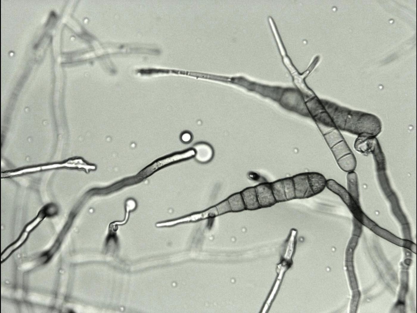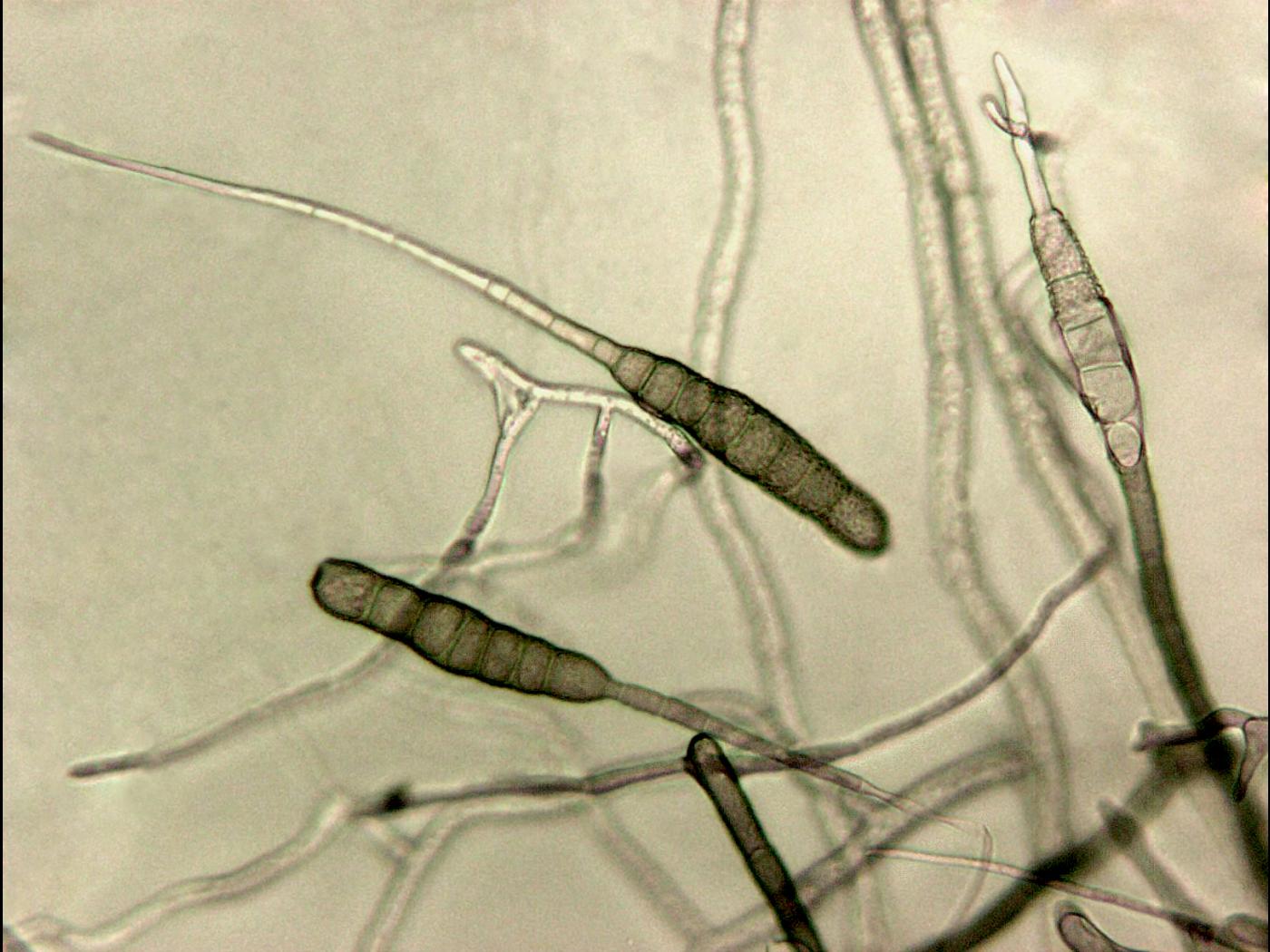 Légende: Conidies, conidiophores et hyphes d'Alternaria solani