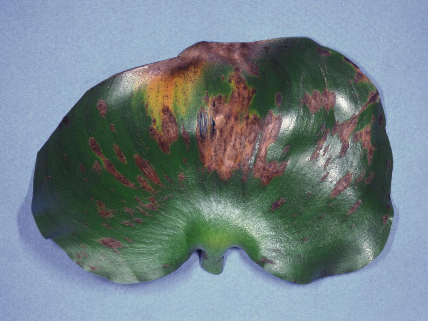 Description: À la face supérieure d’une feuille de jacinthe d’eau provenant d’un bassin d’eau, présence de taches brunes à noires, à contour bien délimité, de forme allongée et parallèles aux nervures. Ces taches mesurent environ 2 x 8 mm. Au centre du limbe, présence d’une grande plage brûlée d'aspect sec. Les observations microscopiques ont révélé la présence des champignons Alternaria sp. et Colletotrichum sp. Ces champignons causent respectivement des taches foliaires et de l’anthracnose.