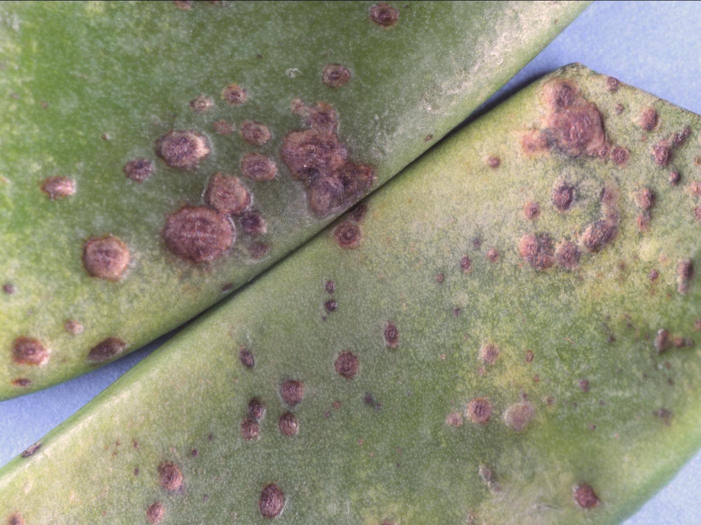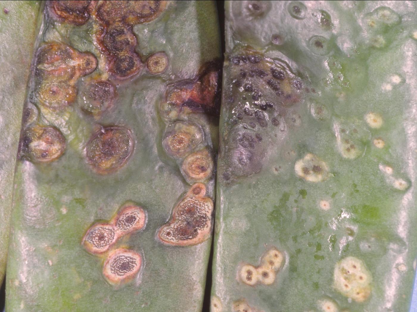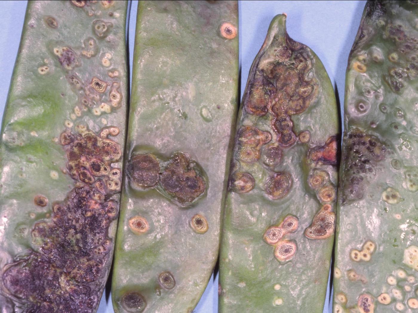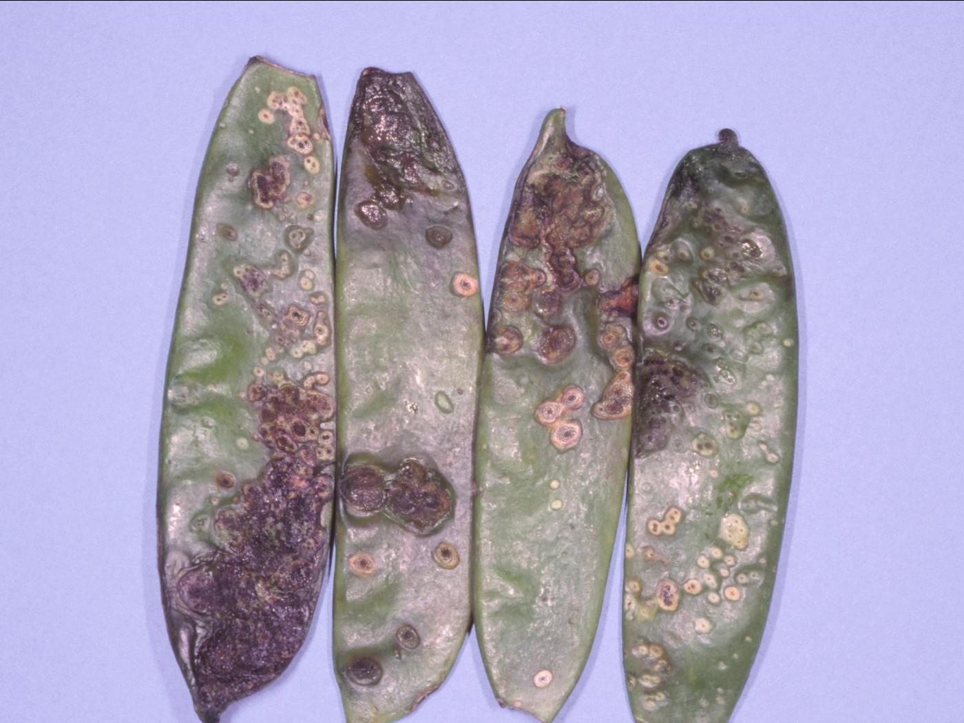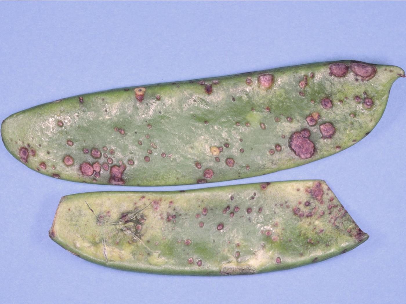 Description: Une vue rapprochée des gousses de pois mange-tout montre des taches plutôt circulaires avec une marge bien définie, mesurant entre 1 et 3 mm de diamètre, et déprimées dans l’épiderme des gousses. Les plus petites taches sont beiges et montrent un point foncé en leur centre. Les grandes taches sont le regroupement de petites taches. Elles sont brun rougeâtre et portent de nombreux points noirs en leur centre. Il peut y avoir jusqu’à 50 taches par gousse. Les tests de laboratoire ont révélé la pré… En savoir plus