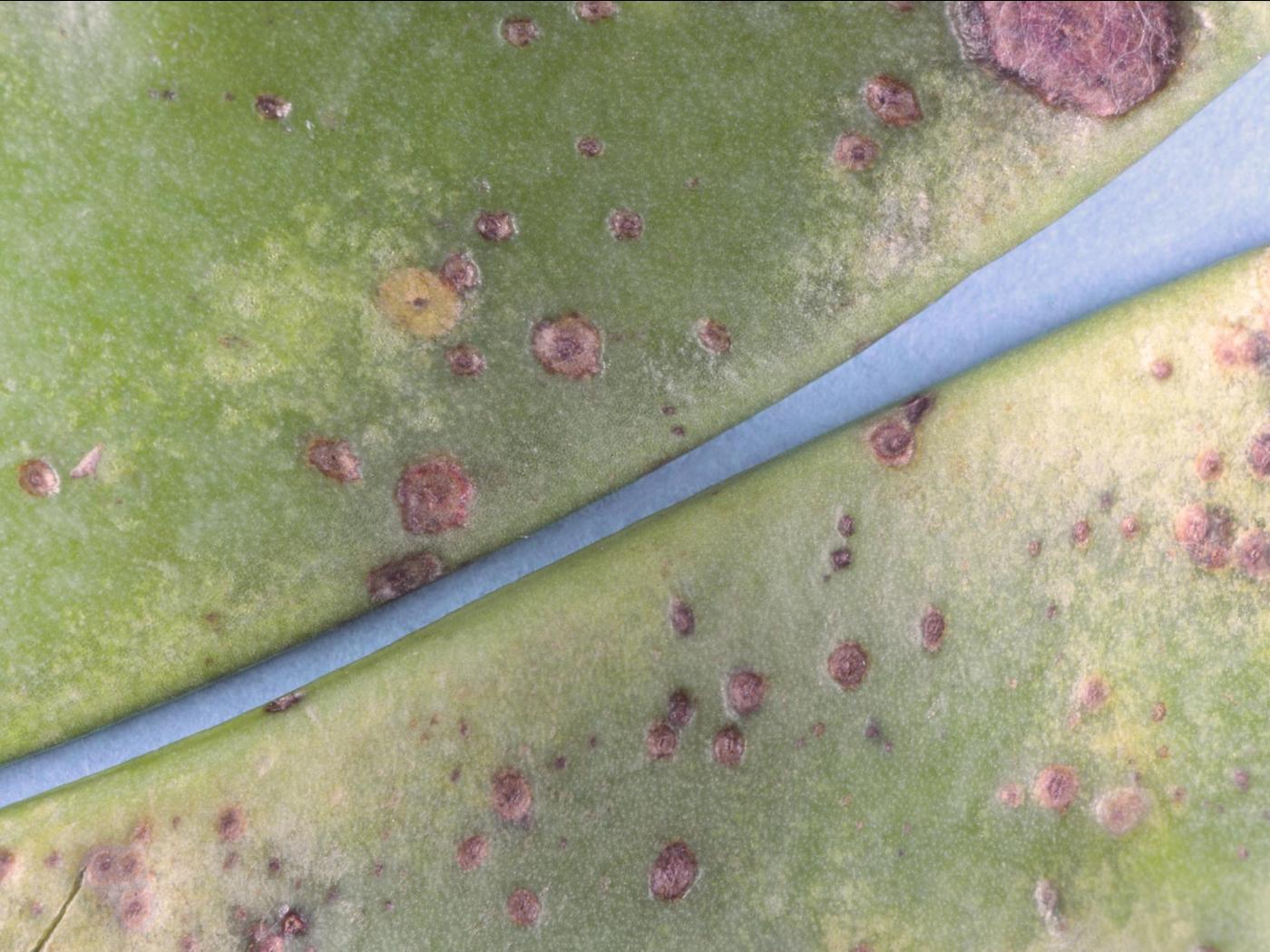 Feuille : présence de taches circulaires légèrement déprimées dont le centre est beige à brun avec une marge foncée bien définie. De nombreuses pycnides sont observées au centre des taches.