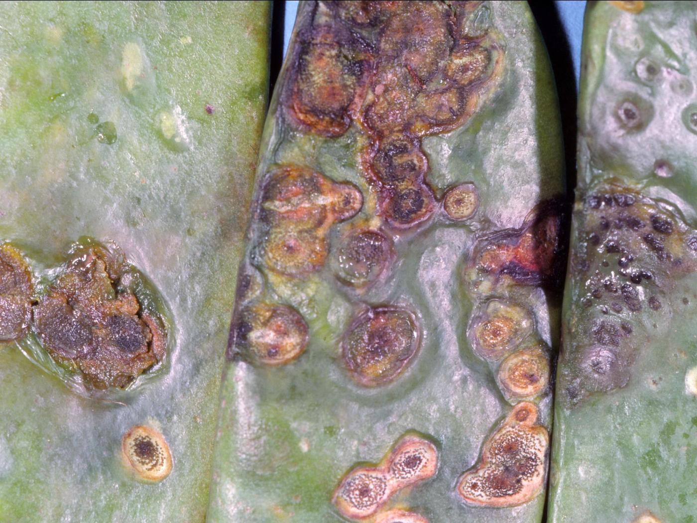 Description: Des gousses de pois mange-tout montrent des taches plutôt circulaires avec une marge bien définie, mesurant entre 1 et 3 mm de diamètre, et déprimées dans l’épiderme des gousses. Les plus petites taches sont beiges et montrent un point foncé en leur centre. Les grandes taches sont le regroupement de petites taches. Elles sont brun rougeâtre et portent de nombreux points noirs en leur centre. Il peut y avoir jusqu’à 50 taches par gousse. Les tests de laboratoire ont révélé la présence du champign… En savoir plus
