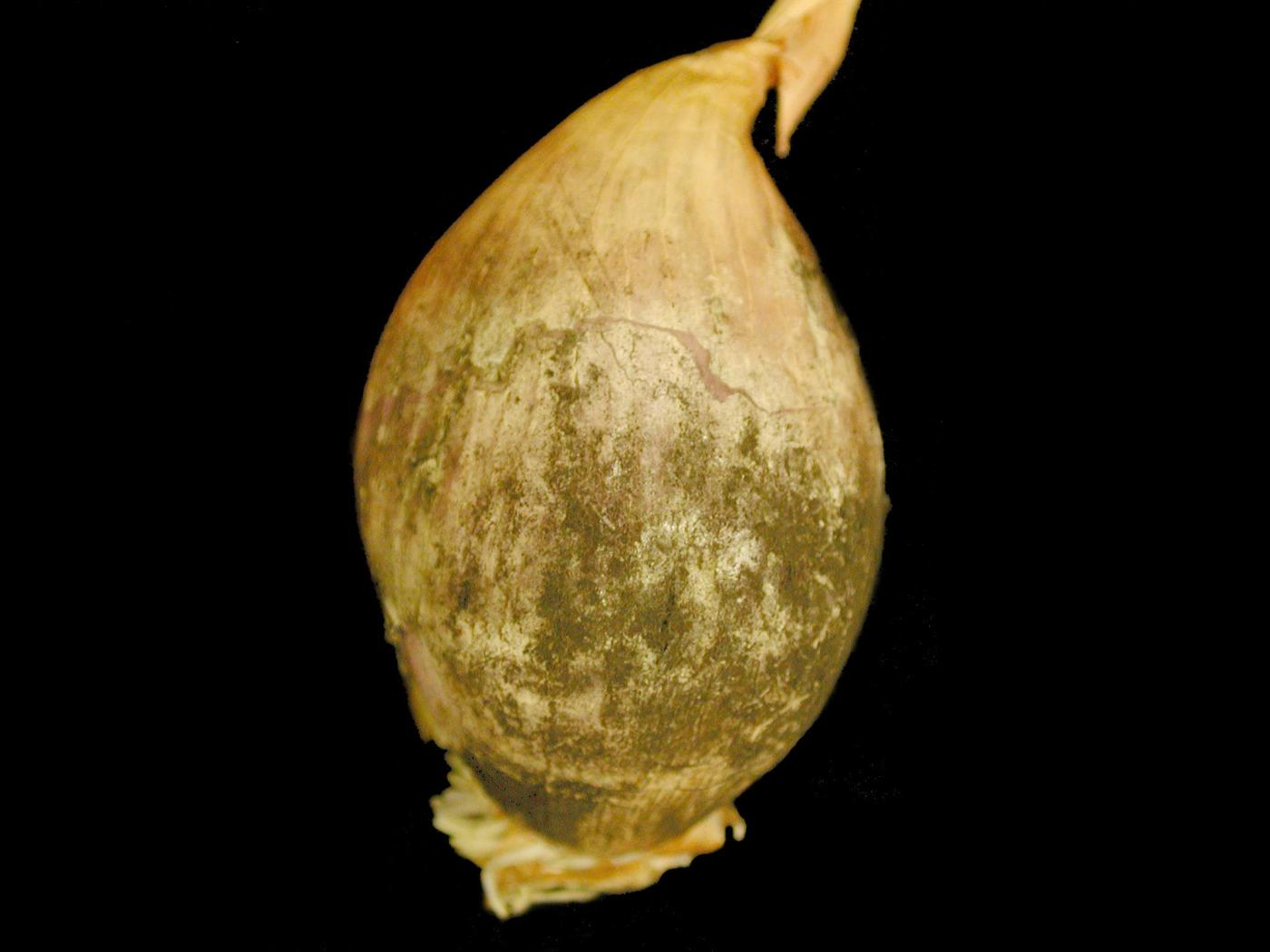 Bulbe : présence d’une coloration noire près du col, de lésions superficielles sur les tuniques sèches, de stries noires (mycélium et conidies) qui longent les nervures verticales des tuniques sèches. À un stade avancé de la maladie, tout le bulbe est noir et ratatiné. Parfois des bactéries secondaires envahissent les bulbes causant de la pourriture molle et une odeur de moisi. Certains bulbes ne montrent aucun symptôme externe, mais lorsqu’ils sont coupés en deux, les tuniques les plus internes sont grises à noires à cause que l’infection débute généralement par le col.