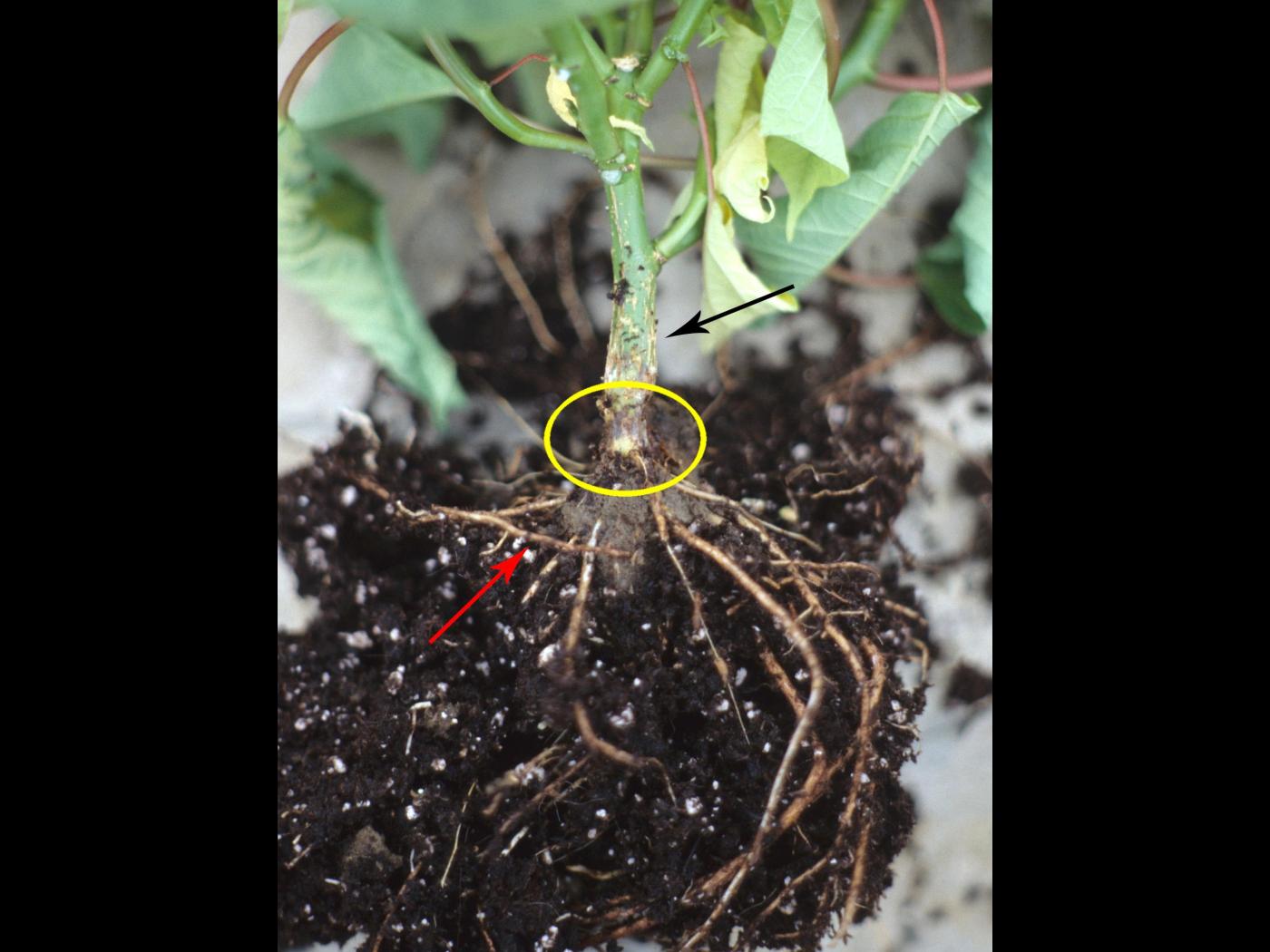 Racine : au début, présence de petites lésions rouges à brunes. Elles s’agglomèrent, forment des zones irrégulières de 3 à 20 mm de diamètre, sont distribuées au hasard sur l’épiderme et deviennent noires. Le système racinaire peut devenir complètement noir et pourrir. Les lésions sont superficielles ou entrent profondément dans le cortex. Retard de croissance de la racine pivotante.