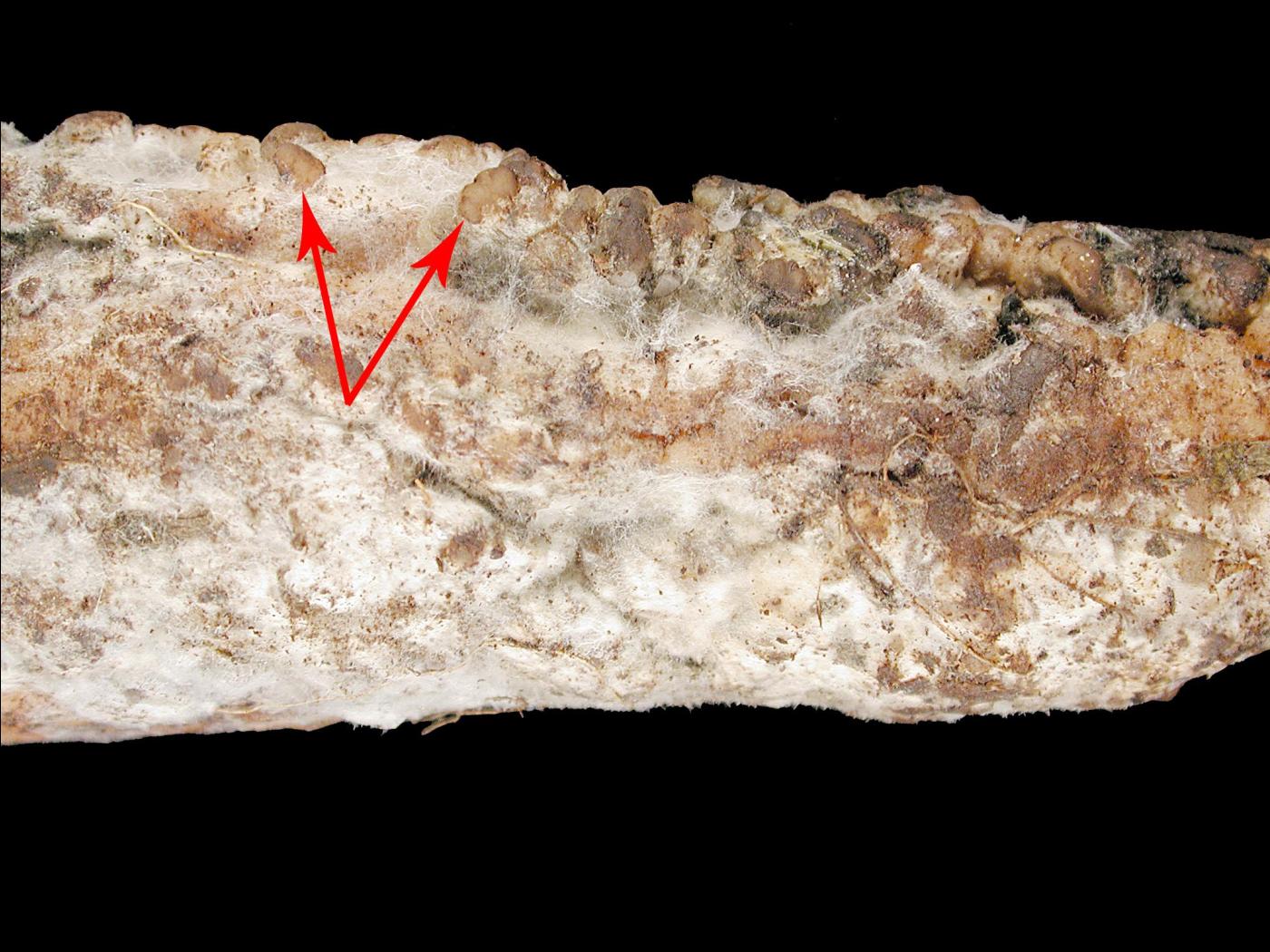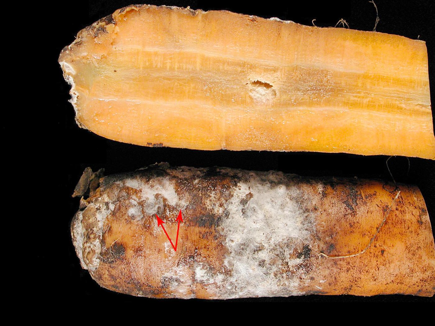 Racine : présence de taches ou lésions humides, beiges à brunes, débutant aléatoirement sur la racine. Les lésions deviennent spongieuses ou d’aspect cuir. Une pourriture brune apparait et elle peut se couvrir d’une sporulation blanchâtre et de sclérotes.