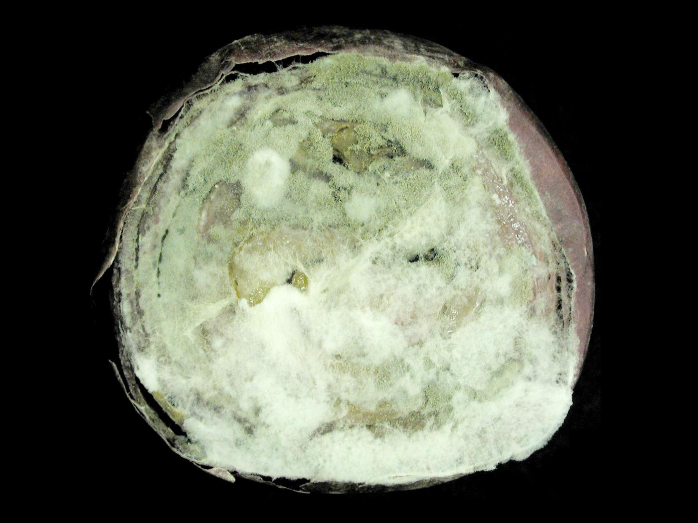 Légende: Pourriture et mycélium grisâtre sur bulbe d'oignon sec