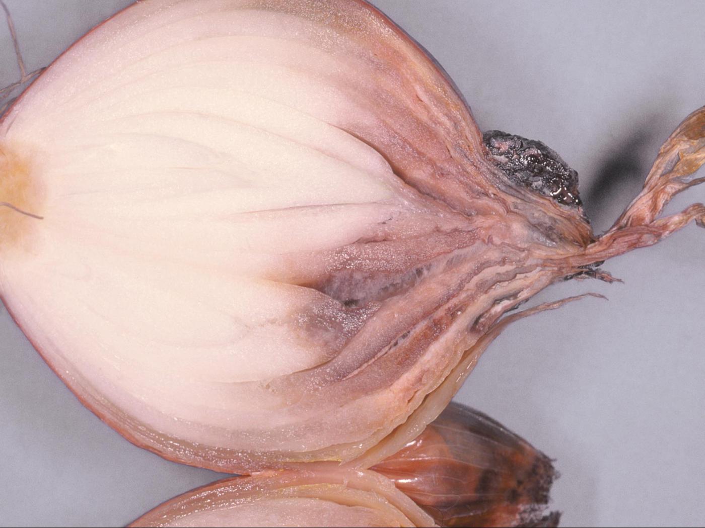 Description: L’intérieur d’un bulbe d’oignon espagnol (cv 'Red Fortress') provenant d’un entrepôt montre une pourriture humide et translucide qui débute au niveau du col et qui descend par la suite vers l’ensemble des tuniques. Des sclérotes noirs sont visibles entre les tuniques (voir flèches). La démarcation entre les tissus affectés et sains est nette. Les tests de laboratoire ont révélé la présence du champignon Botrytis sp., responsable de la pourriture du col chez les Allium.   Le conseiller agricole m… En savoir plus