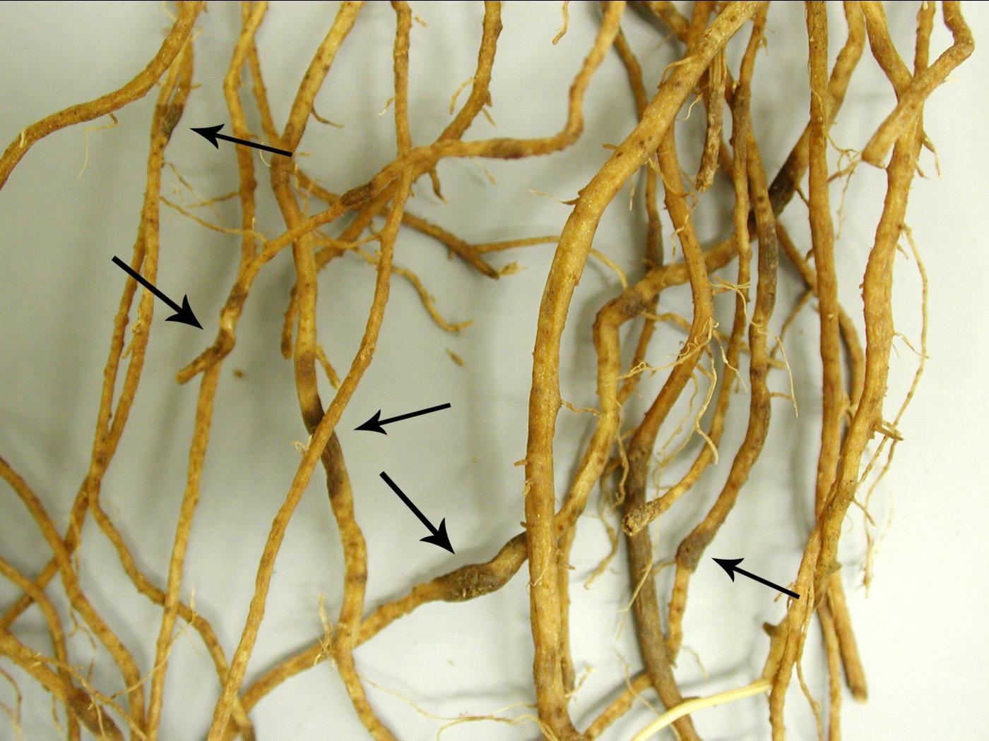 Racine : présence de lésions (taches) brunes bien délimitées sur les racines. Quand les racines amorcent leur sénescence, des microsclérotes apparaissent en surface. Le cortex des grosses racines devient fortement altéré, pourri, fragile et s’enlève facilement. Les racines secondaires dépérissent et se décomposent, facilitant l’arrachage des plants affectés. Les symptômes deviennent évidents sur le plant quand les fruits commencent à mûrir.