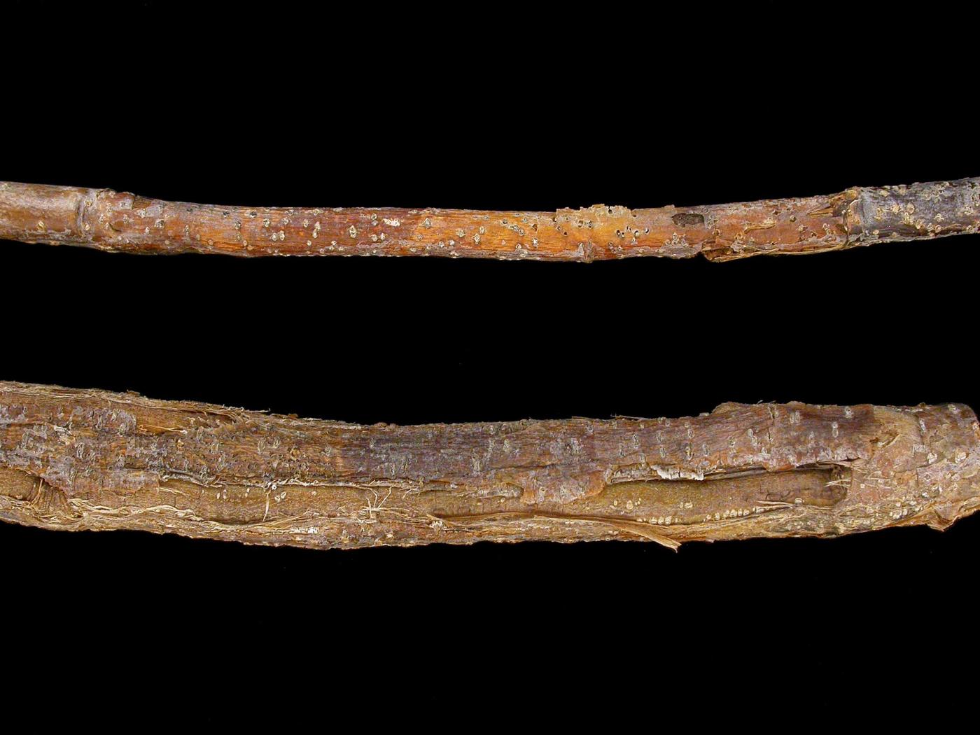 Branche et tronc : au début, les chancres sont rougeâtres, superficiels et forment de petites cloques puis deviennent bruns à noirs et lisses. Sur les arbres vigoureux, le cambium est rarement affecté et les chancres se cicatrisent graduellement et finissent par disparaître. Sur les arbres affaiblis, les chancres prennent de l’expansion, entourent le tronc ou les branches qui finissent par dépérir et mourir. Des tissus calleux se forment à la marge des chancres. Présence de pycnides dans le bois mort ou dépérissant.