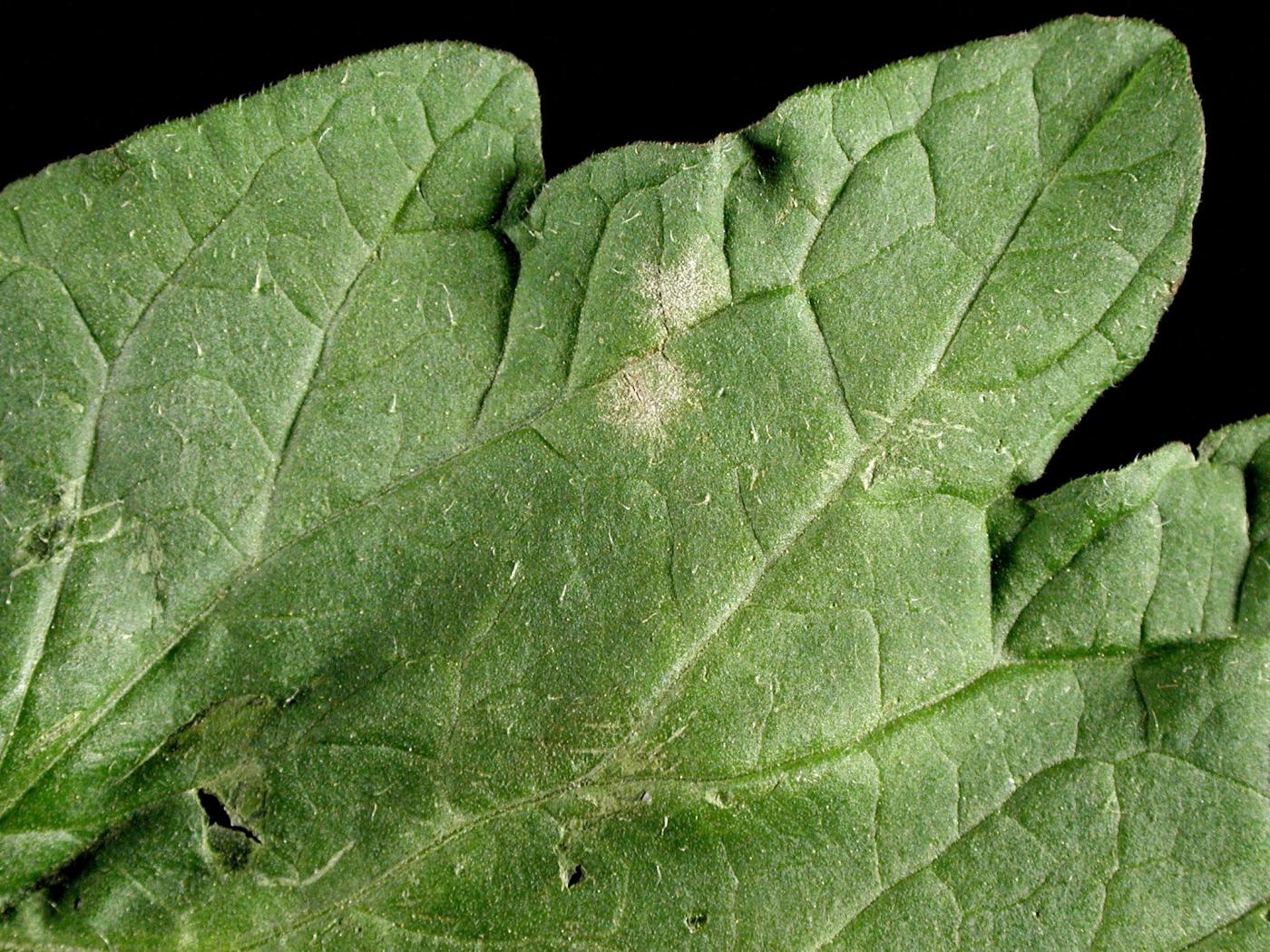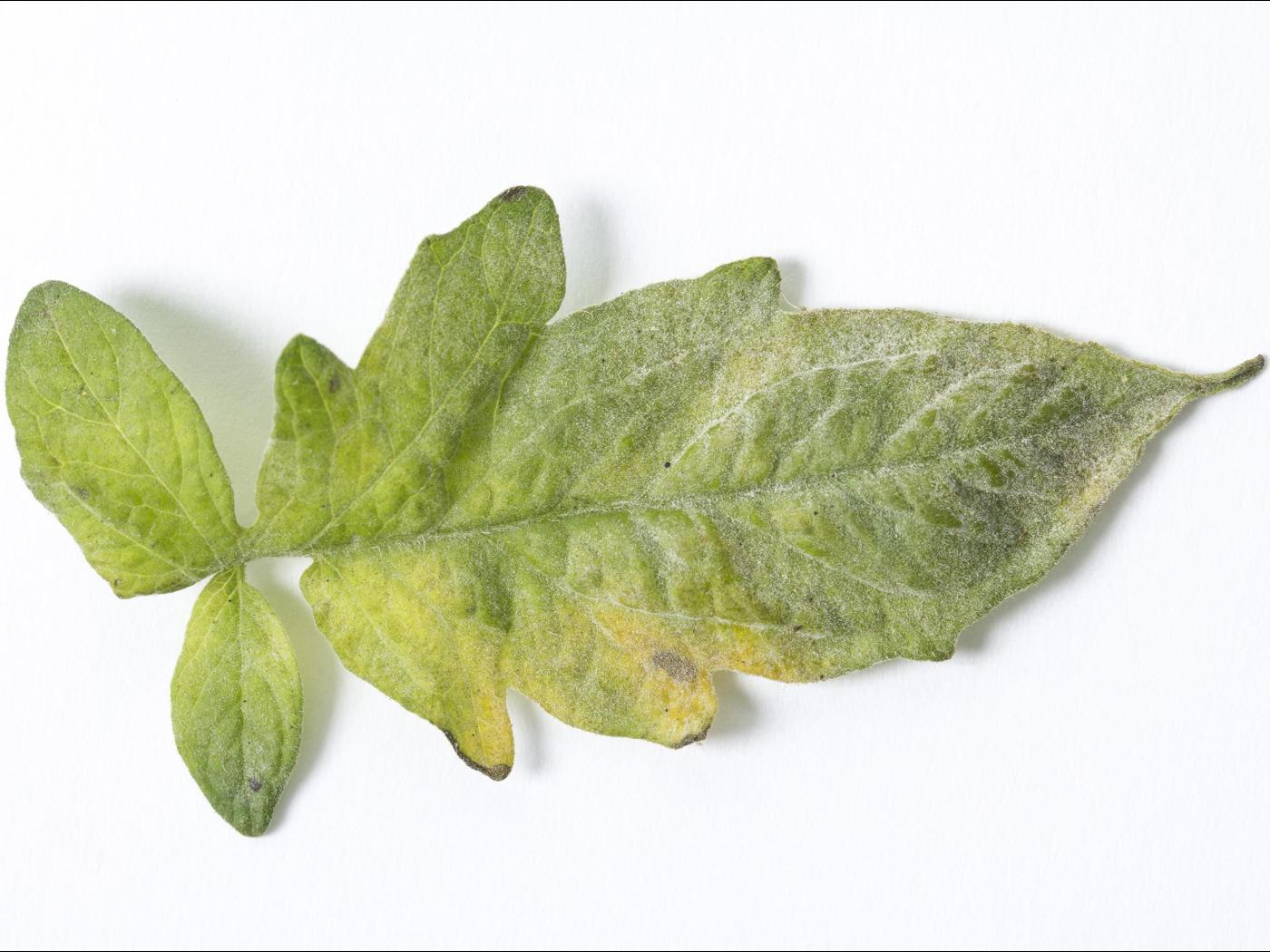 Feuille : à la face supérieure, présence de petites taches vert pâle à jaunes, d’une forme circulaire à angulaire, qui se couvrent d’un duvet blanc de mycélium et de conidies. Le duvet de mycélium tapisse parfois presque toute la surface foliaire. La sporulation peut être observée à la face inférieure. Les taches se manifestent en premier sur les vieilles feuilles puis progressent vers le haut du plant. Les feuilles infectées demeurent attachées à la tige.