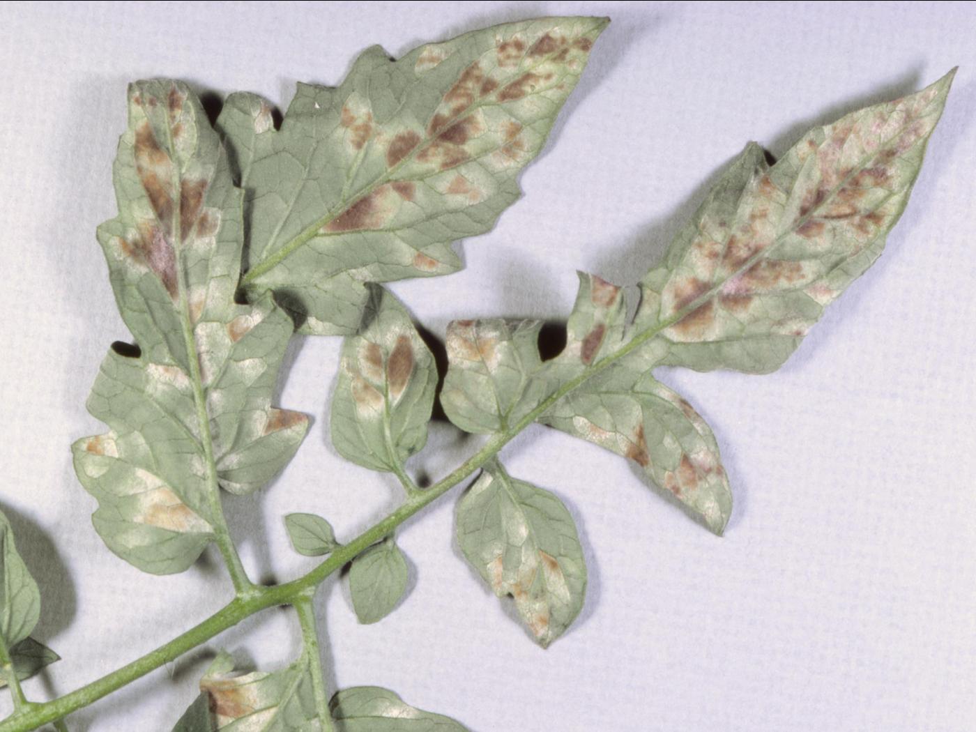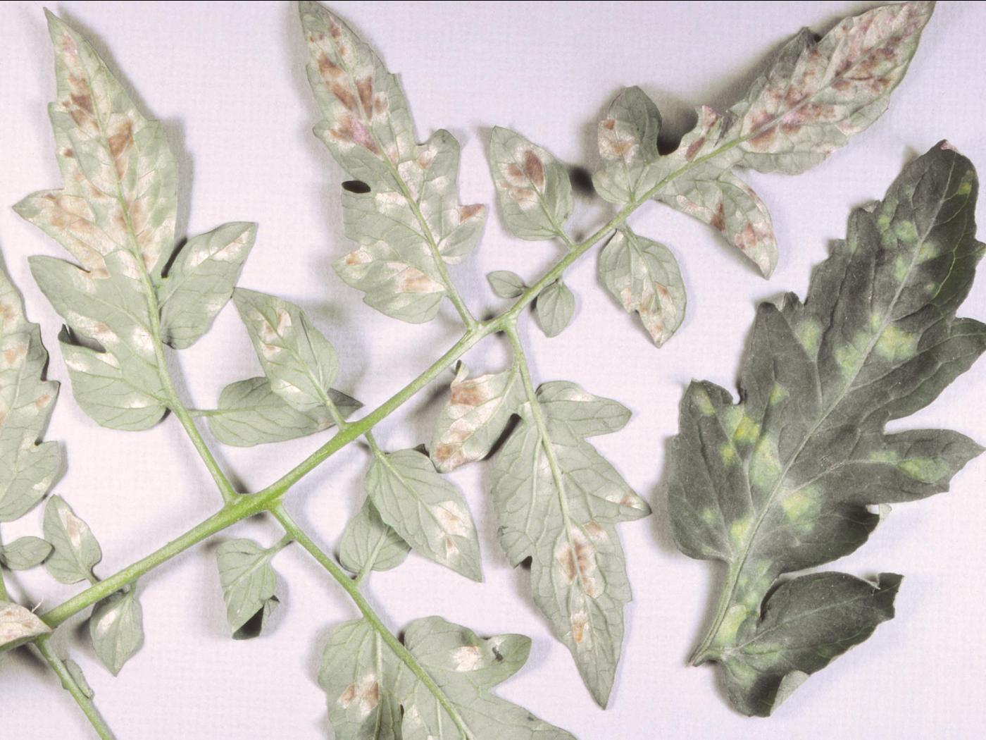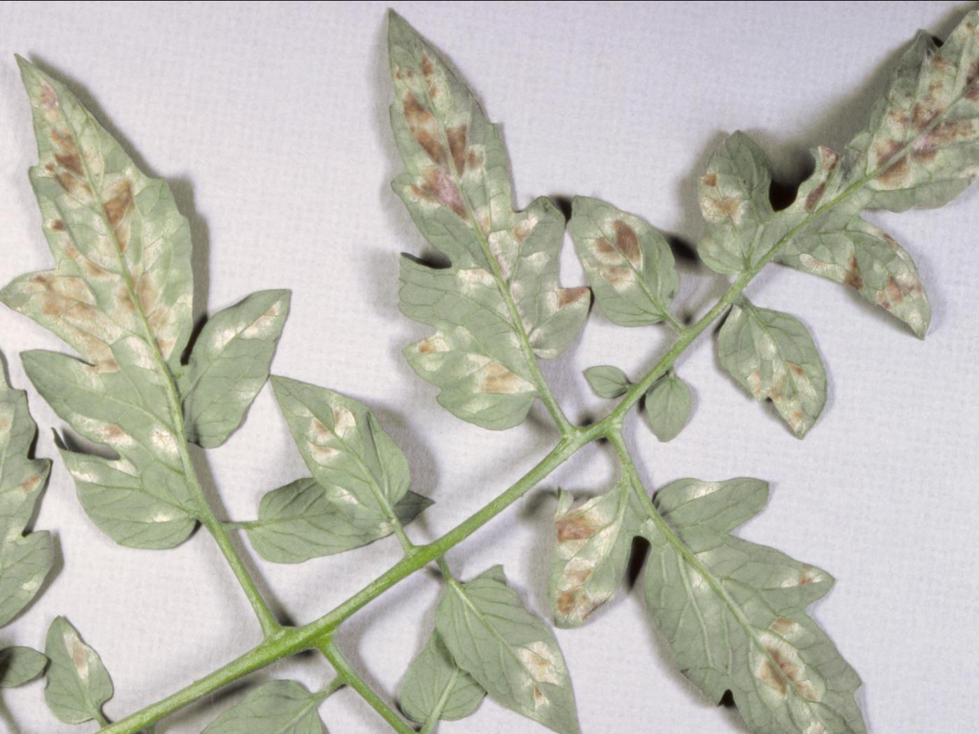 Légende: Taches blanches et mycélium brun sur feuille de tomate