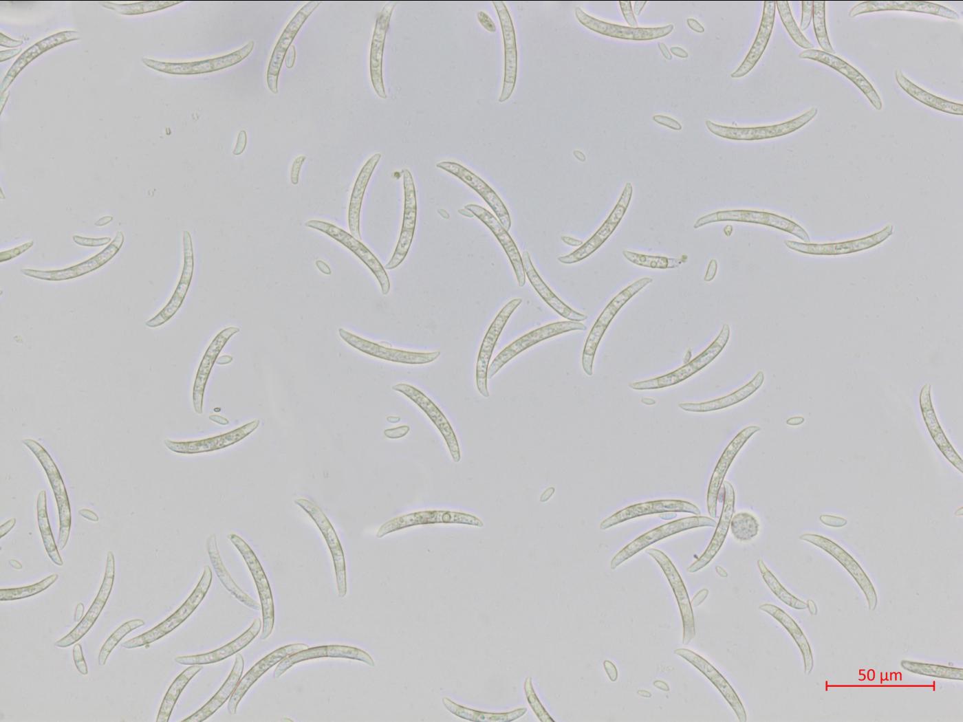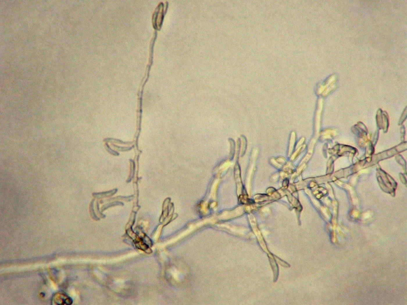 - Microconidies : 0 septation (= amérospores) (habituellement) / 1 septation (= didymospores) (rarement). Agglomérées en "fausses têtes". Hyalines. De forme variable (ovale/ellipsoïde à cylindrique). Droites ou incurvées. Dimension : 5-12 x 2,2-3,5 μm. Produites par de courtes monophialides (absence de polyphialide) qui sont localisées latéralement sur l'hyphe ou sur de courts conidiophores faiblement ramifiés.