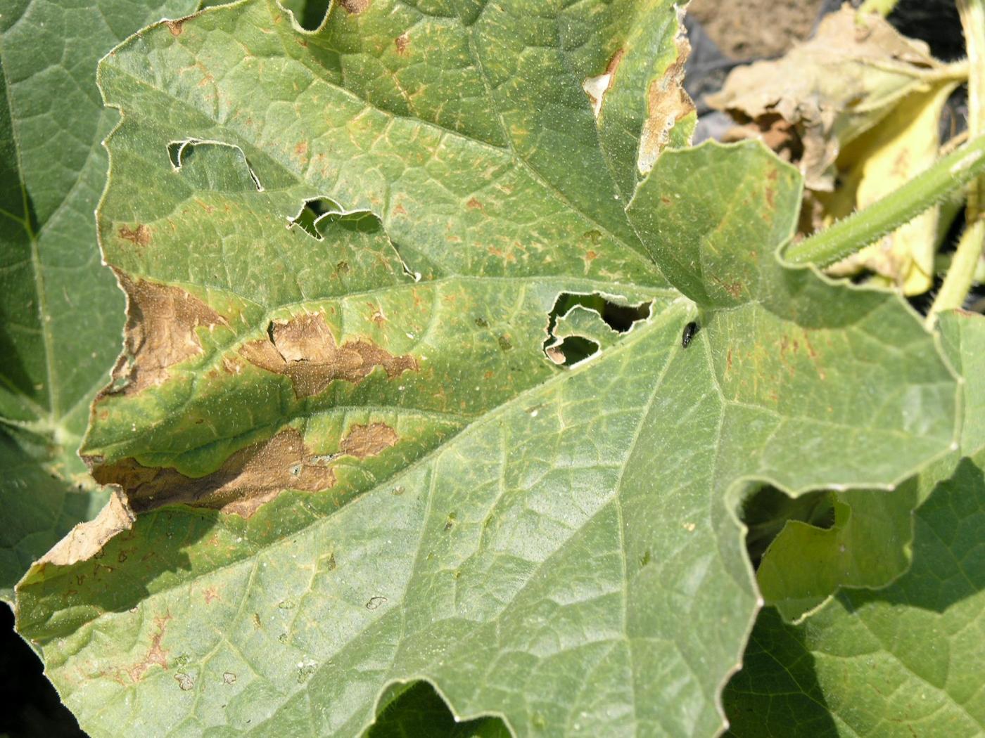 Cette maladie peut être confondue avec des dommages dus à des stress thermiques ou hydriques, le flétrissement bactérien (Erwinia tracheiphila – brûlures en forme de « V ») et le chancre gommeux (Didymella bryoniae – taches le long de la marge ou sur le limbe, présence de pycnides sur la tige).