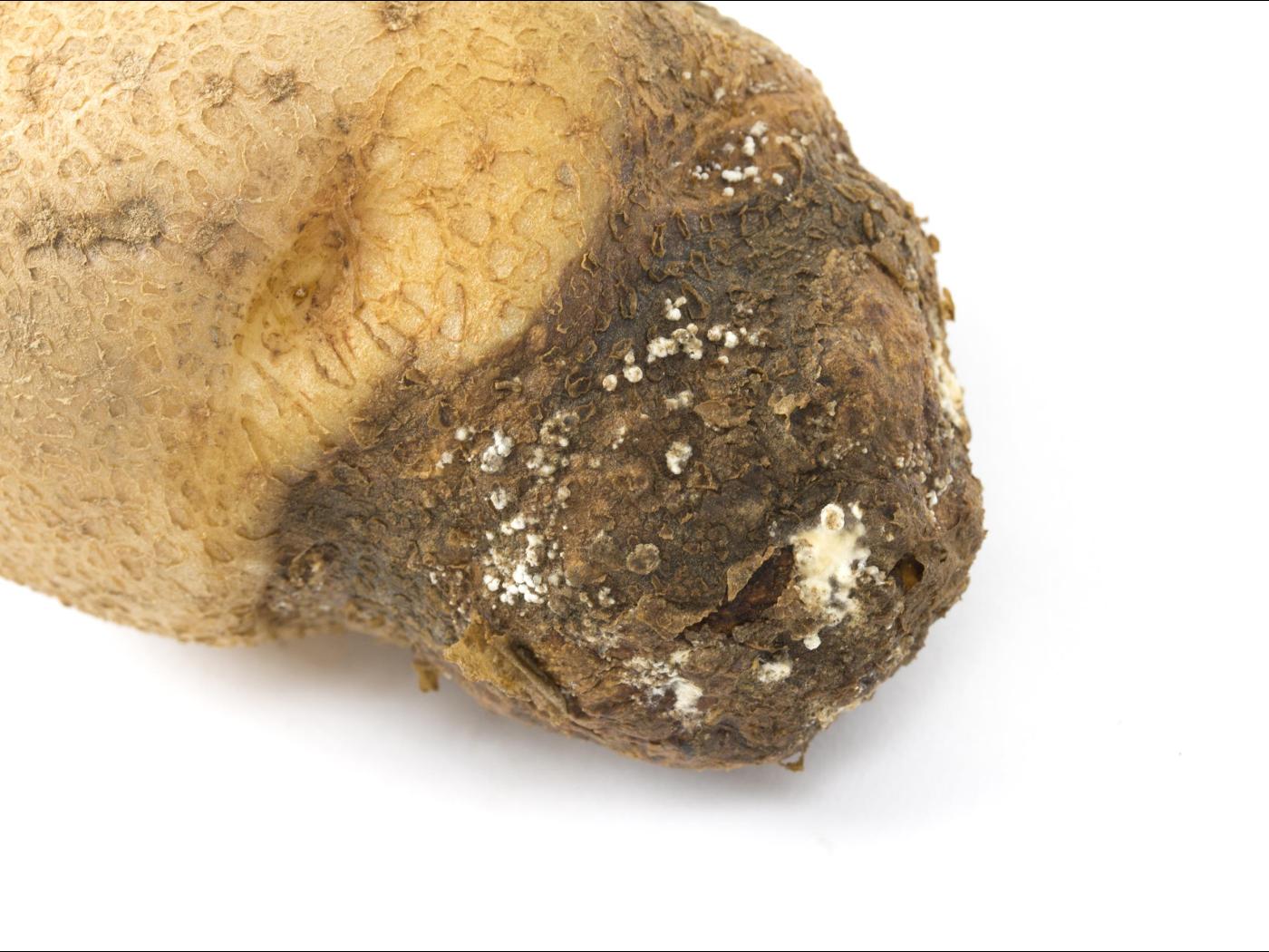 Tubercule : le périderme blessé montre de la pourriture sèche puis se couvre de grands anneaux concentriques déprimés qui s’affaissent sous une légère pression. Les tubercules complètement pourris sont ratatinés et se momifient. Parfois, du mycélium est présent sur le périderme. La chair montre des tissus brun pâle à gris à noirs, qui sont d’abord humides puis deviennent très secs avec des cavités tapissées de mycélium de différentes couleurs (blanc, rose, crème, 'bleuté', rougeâtre). L’intérieur du tubercule peut être complètement détruit. Il n’y a pas d’odeur caractéristique. Les tubercules sont mous si des bactéries envahissent les tissus.