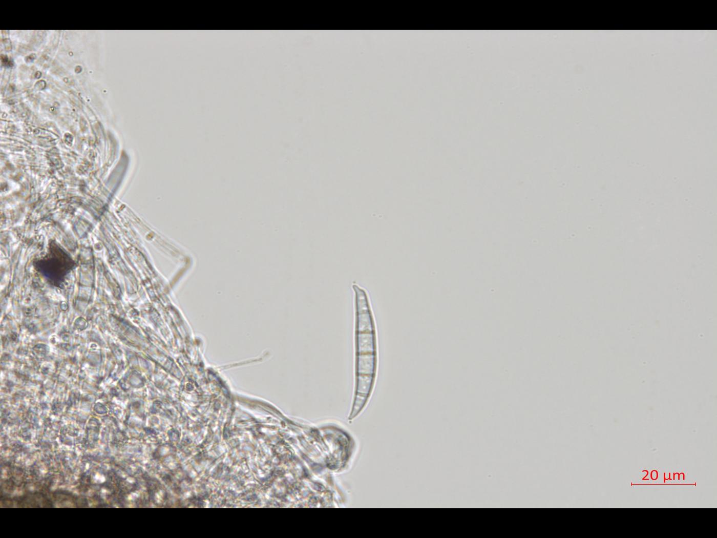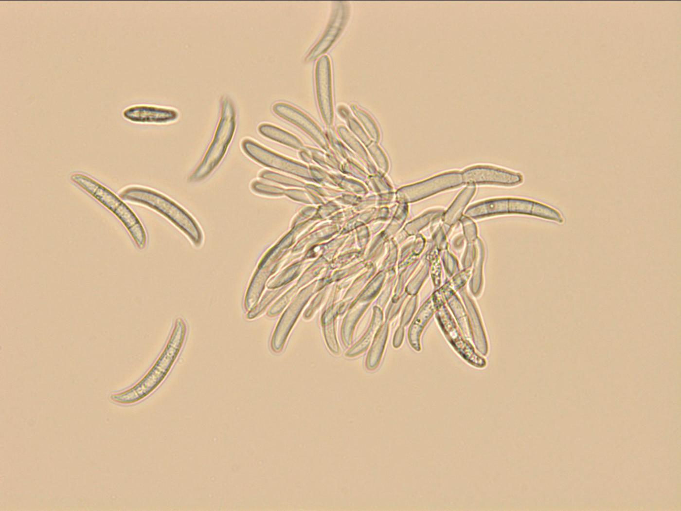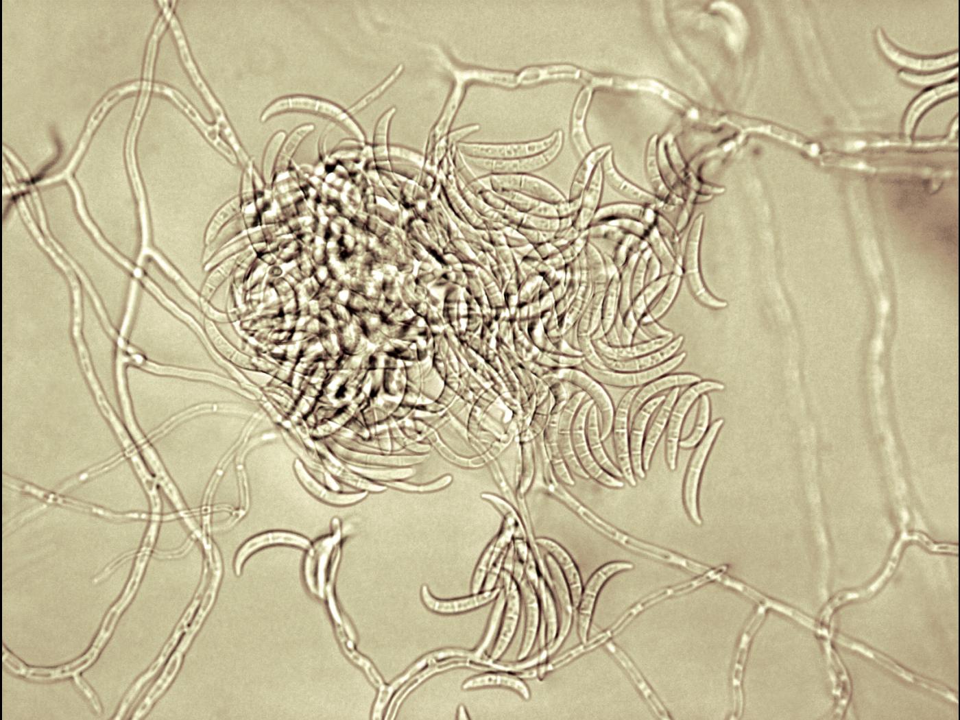 - Macroconidies : Phragmospores (= spores allongées avec des septations transversales). Fusiformes ou falciformes (= en forme de faucille), plus ou moins arquées. Généralement hyalines (si seules) / souvent orangées (si regroupées). Les caractéristiques à examiner sont : le nombre de septation, la cellule apicale et la cellule basale (cette dernière peut être en forme de pied ou non). Les macroconidies peuvent être regroupées en sporodochies (souvent orangées).
