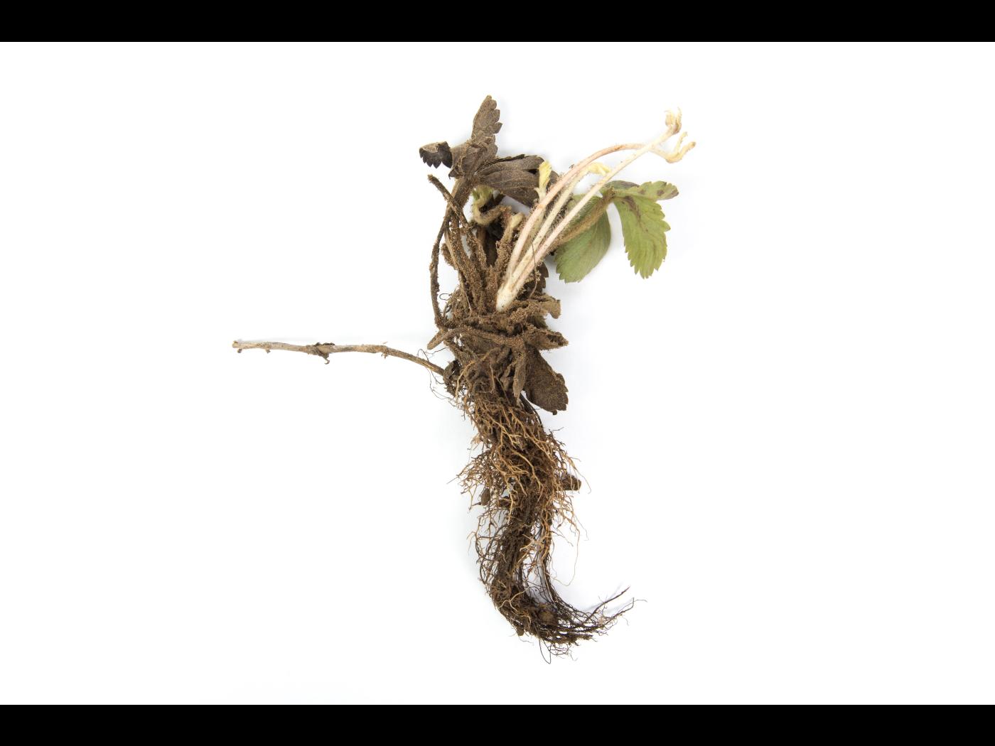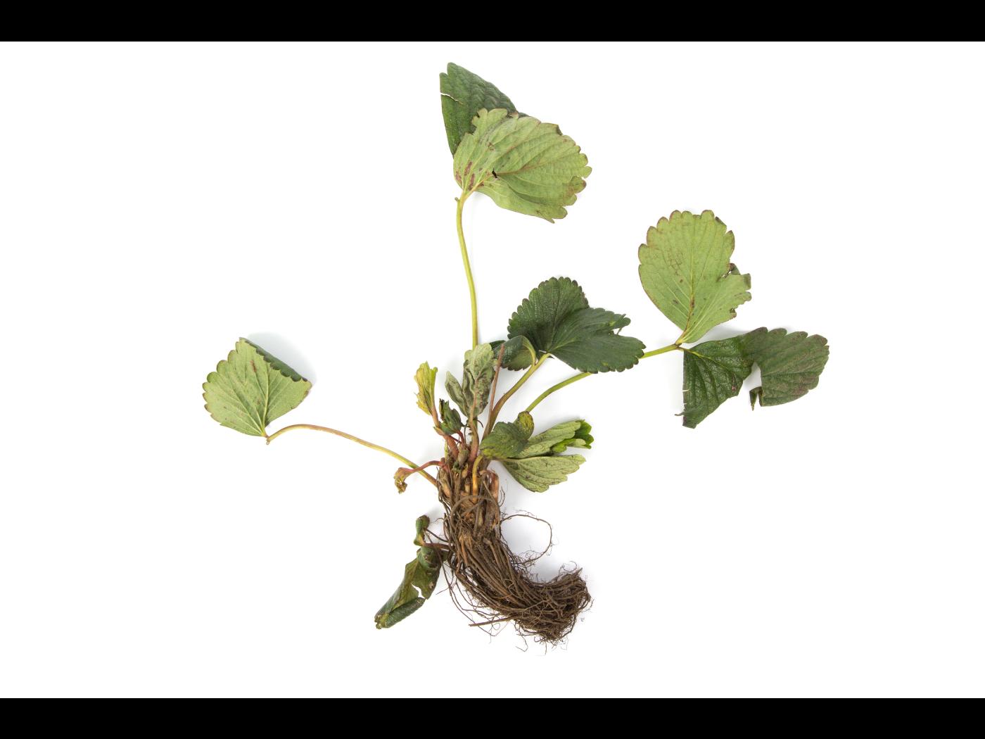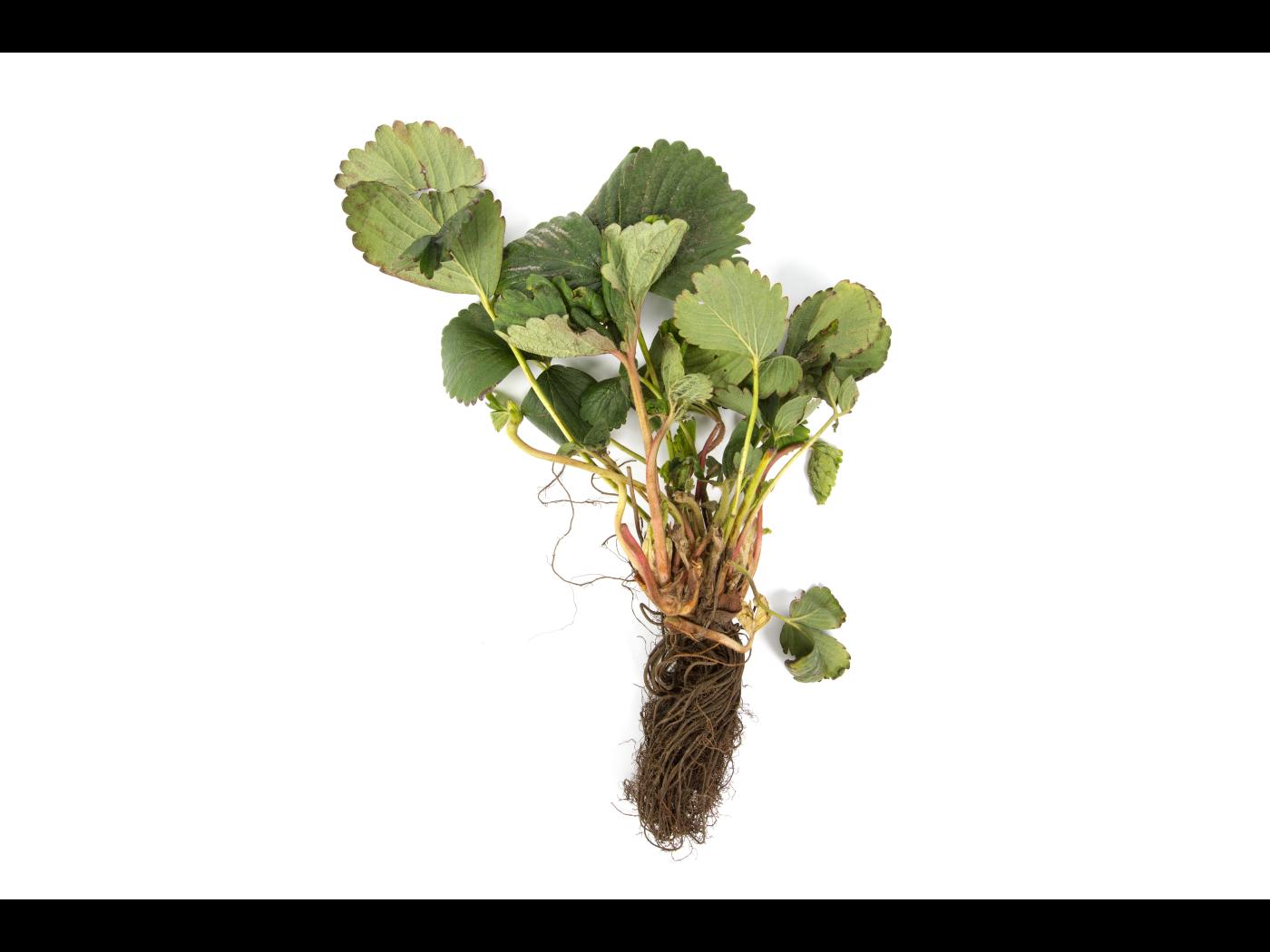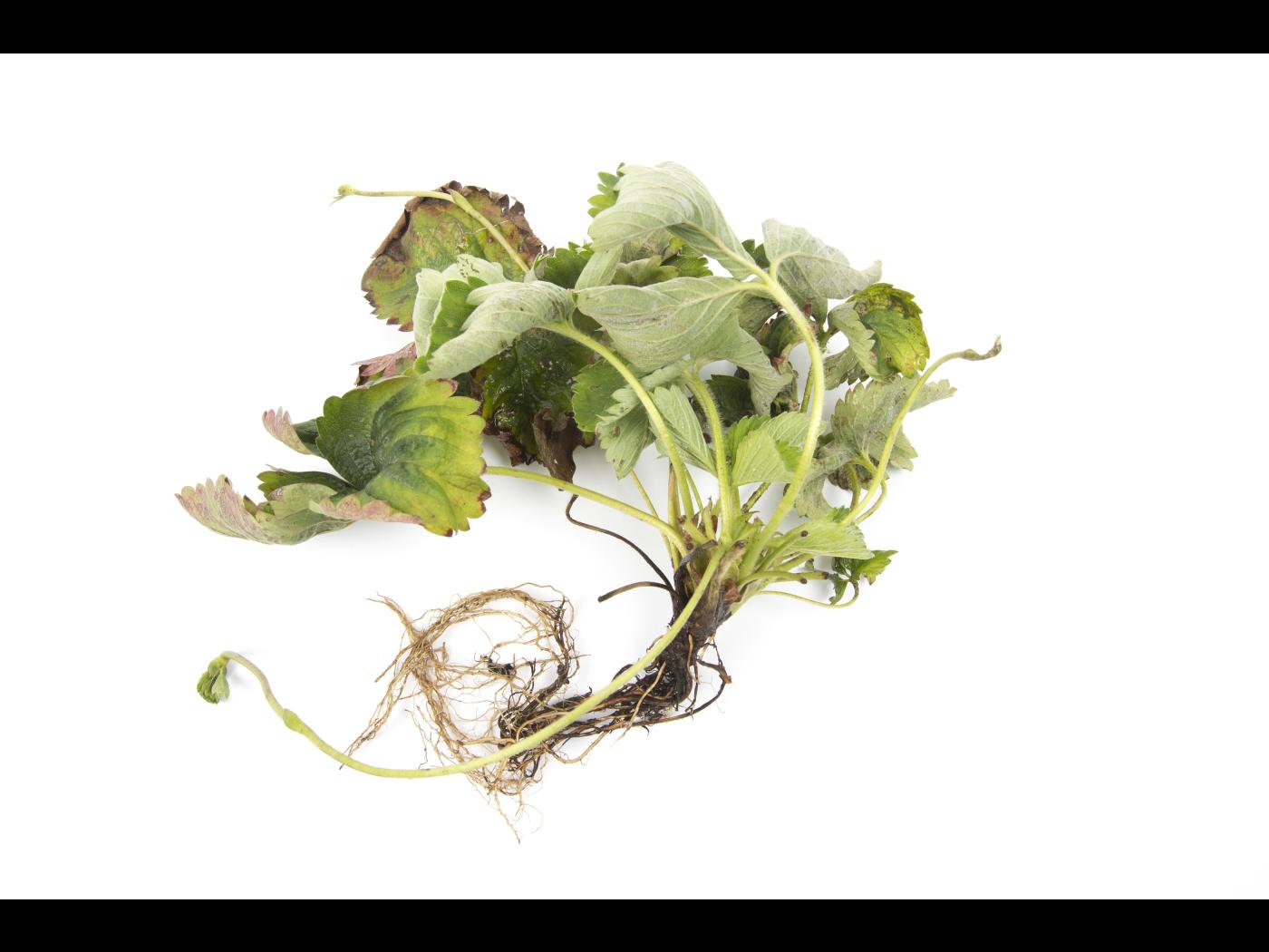 Plante entière : faible développement, rabougrissement, dessèchement et dépérissement des plants. La production de stolons peut être restreinte.