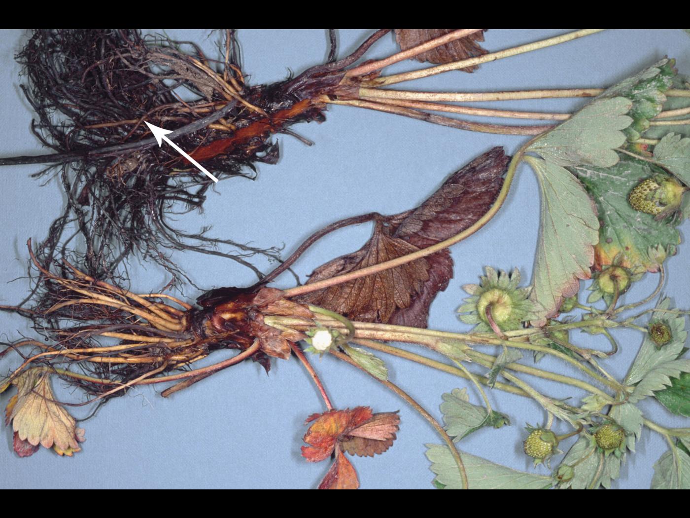 Ces symptômes peuvent être confondus avec la verticilliose (Verticillium spp.) mais dans ce cas, le système vasculaire est brun, la stèle rouge (Phytophthora fragariae) et comme ledit son nom, la stèle est rouge, du gel hivernal (les tissus internes du collet sont bruns) et des dégâts causés par le charançon de la racine du fraisier (Otiorhynchus ovatus) et le hanneton commun (Phyllophaga anxia). Dans le cas de ces insectes, il y aura présence de larves, d’excréments et/ou de blessures aux racines. Dans tous ces cas, les plants sont rabougris ou fanés.