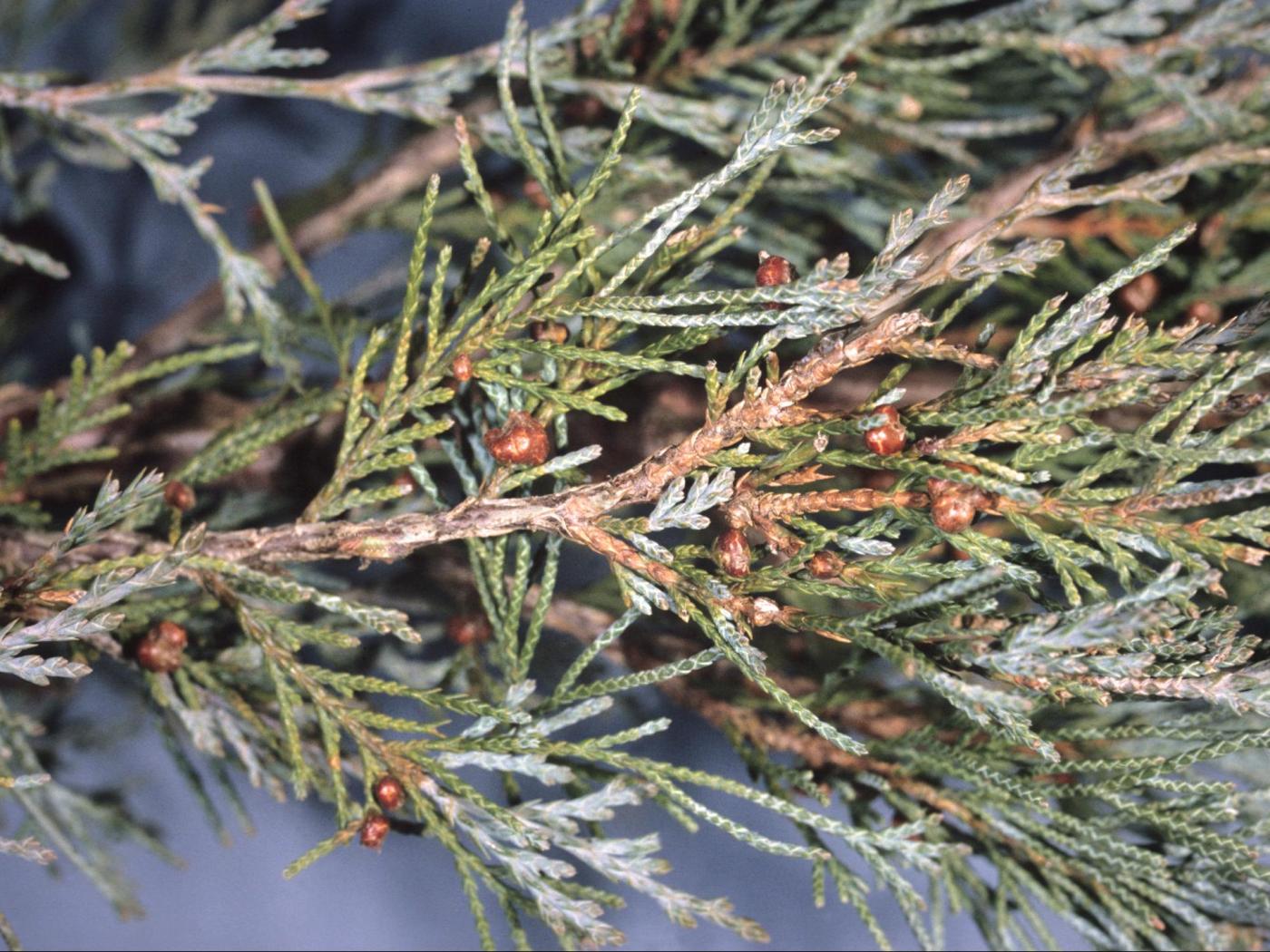 La rouille causée par le champignon Gymnosporangium infecte les arbres et arbustes de la famille des cupressacées qui comprend les genévriers (Juniperus). La majorité de ces rouilles requiert un hôte alterne de la famille des rosacées pour compléter son cycle vital. Parmi les plus fréquentes au Québec notons la rouille du genévrier (G. juniperi-virginiana), la rouille du cognassier (G. clavipes) et la rouille de l’aubépine (G. globosum). Leur cycle vital et les méthodes de lutte sont similaires. Le développement de la rouille du genévrier se fait généralement sur le genévrier de Virginie (J. virginianae) et les Malus spp. (pommier, pommetier). La rouille est une maladie occasionnelle et mineure et les rendements ne sont généralement pas affectés.