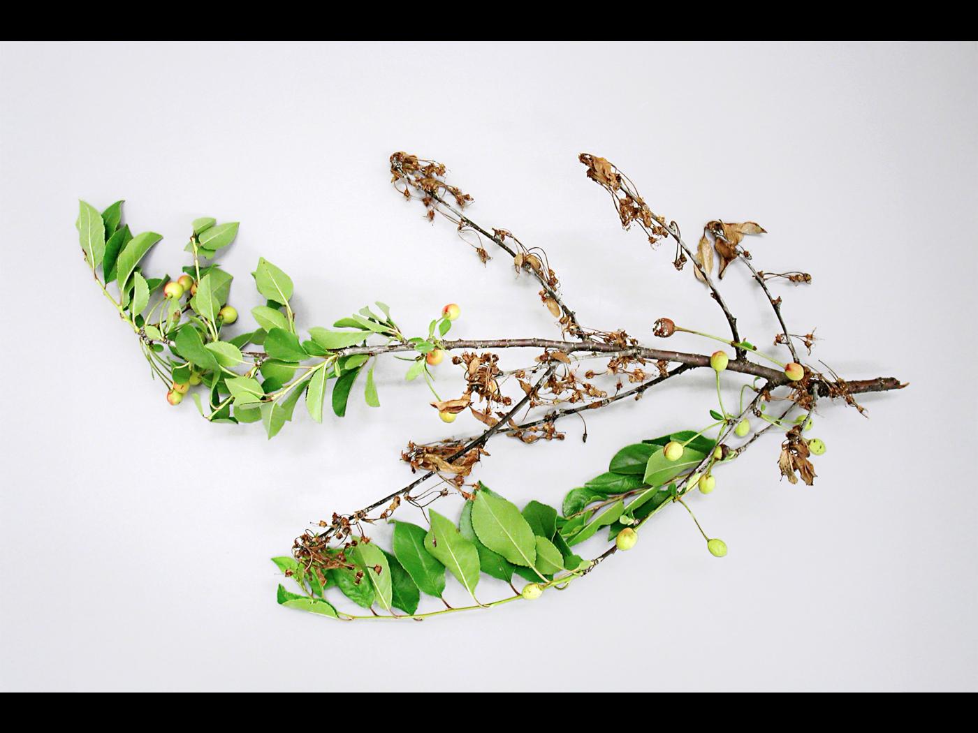 Description: Cerisier nain rustique Plusieurs tiges de ce cerisier nain rustique sont infectées par la pourriture brune. Les fleurs et les feuilles infectées sont brunies et séchées. Les fruits sont pourris et se momifient.