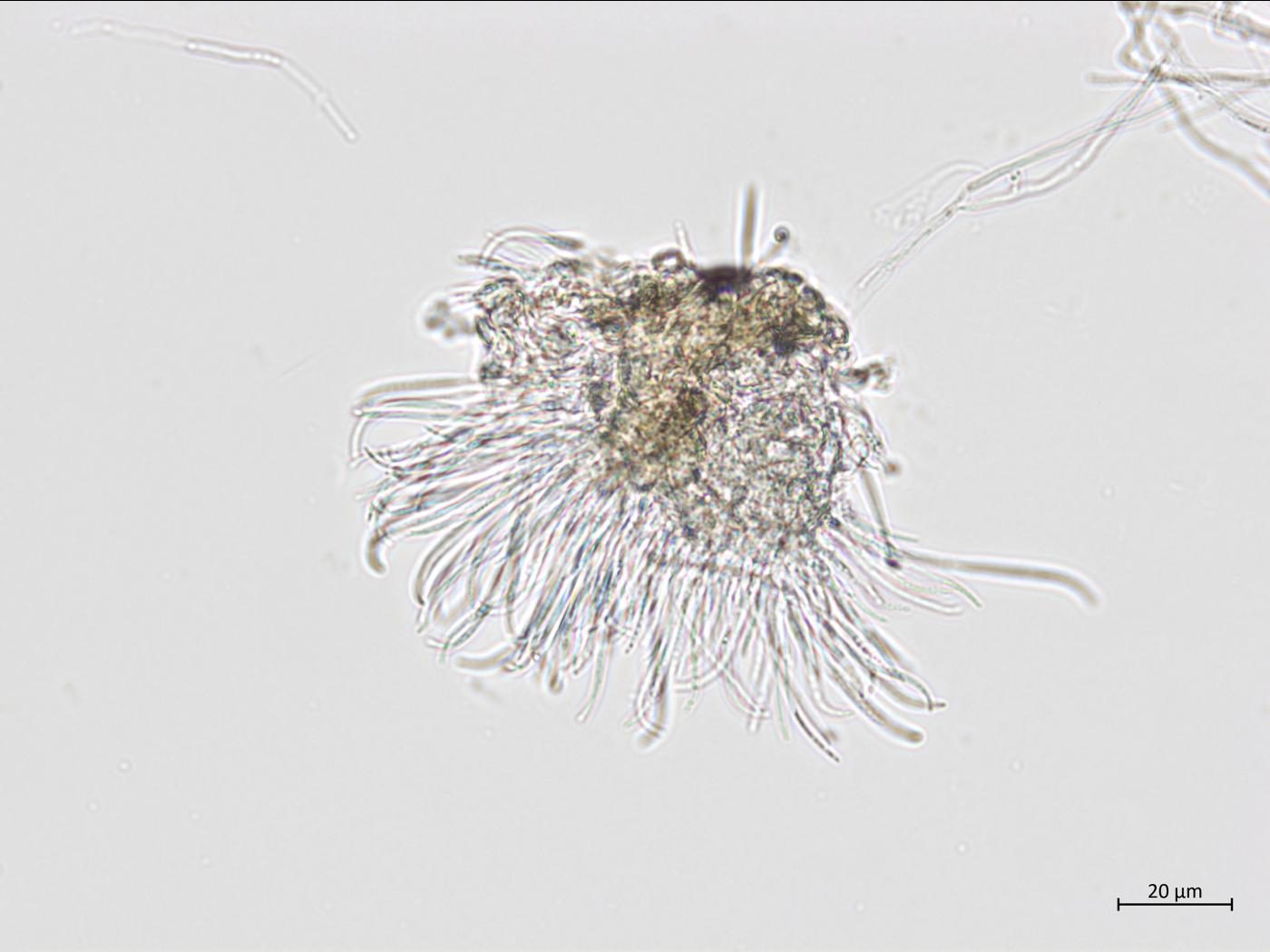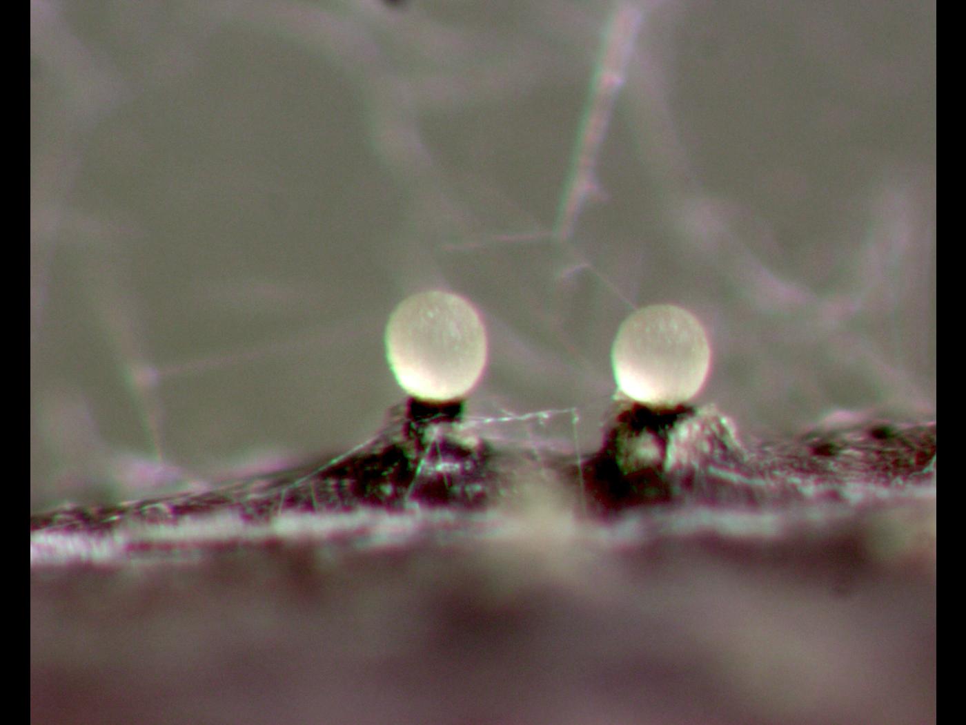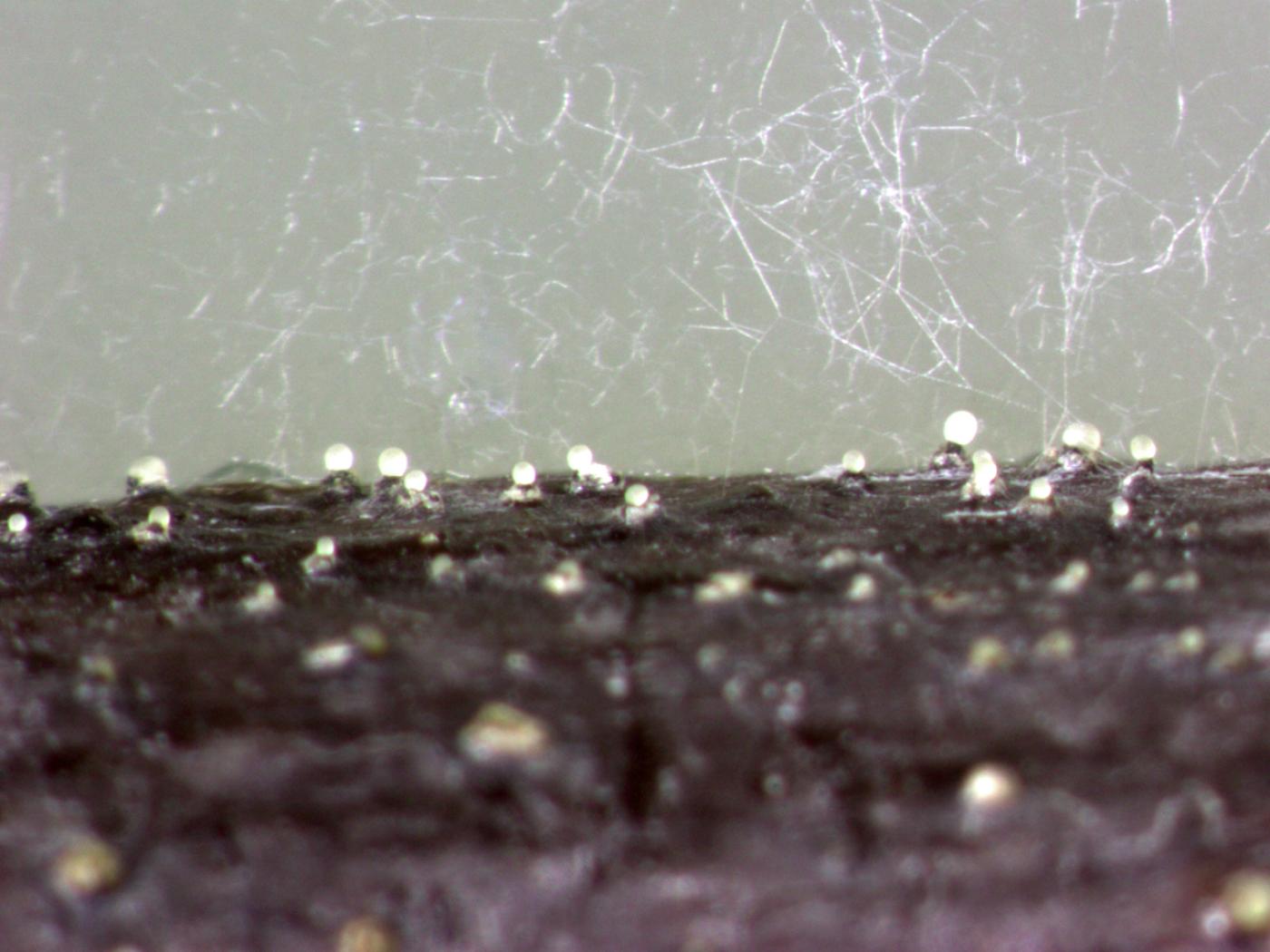 Légende: Exsudats blanchâtres de conidies (= mucus globuleux) provenant de pycnides de Phomopsis sp., sur une pièce végétale déposée sur un milieu de culture gélosé (Stéréomicroscope)