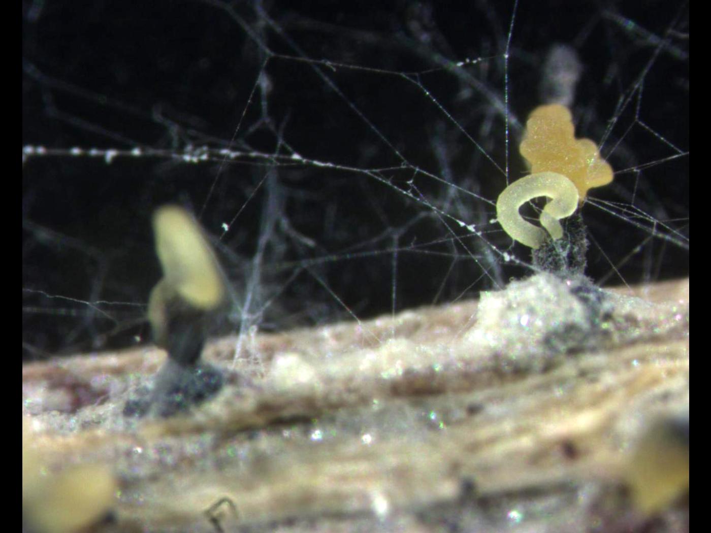 Légende: Exsudats jaune-crème de conidies (= mucus globuleux) provenant de pycnides non visibles de Phomopsis sp. recouvrant une pièce végétale déposée sur un milieu de culture gélosé (Stéréomicroscope)
