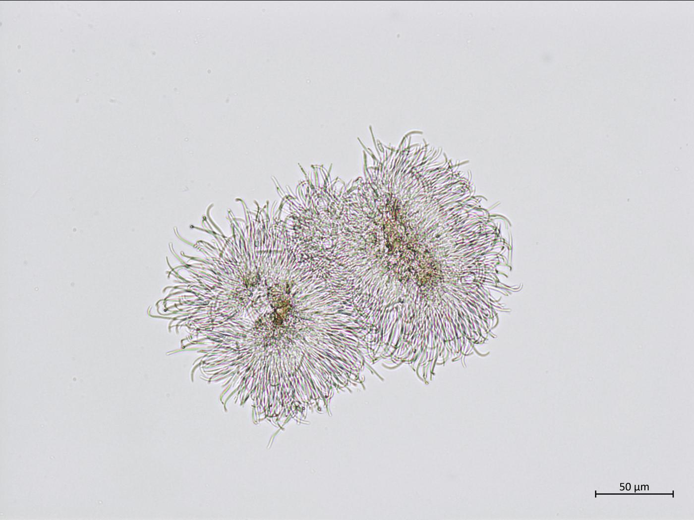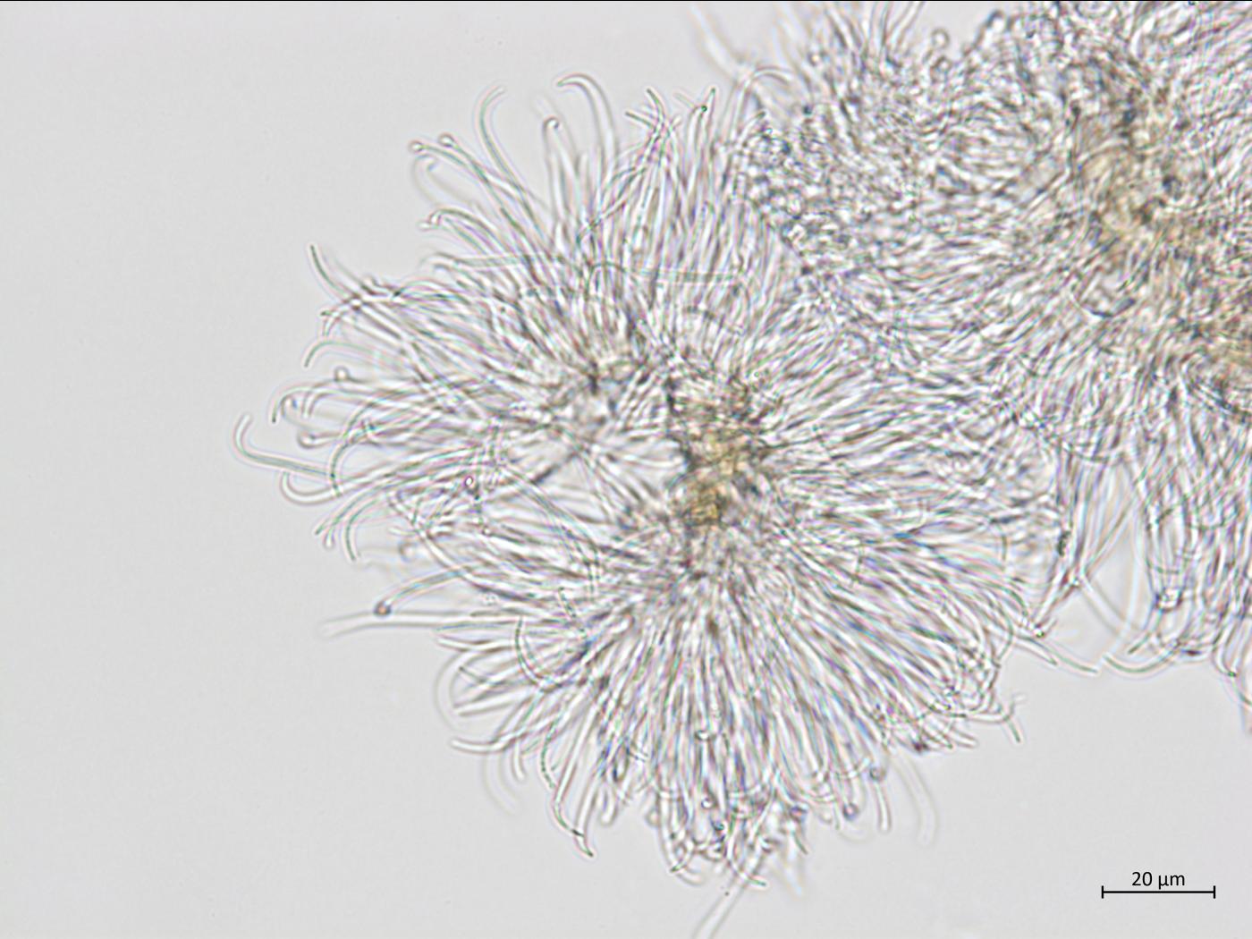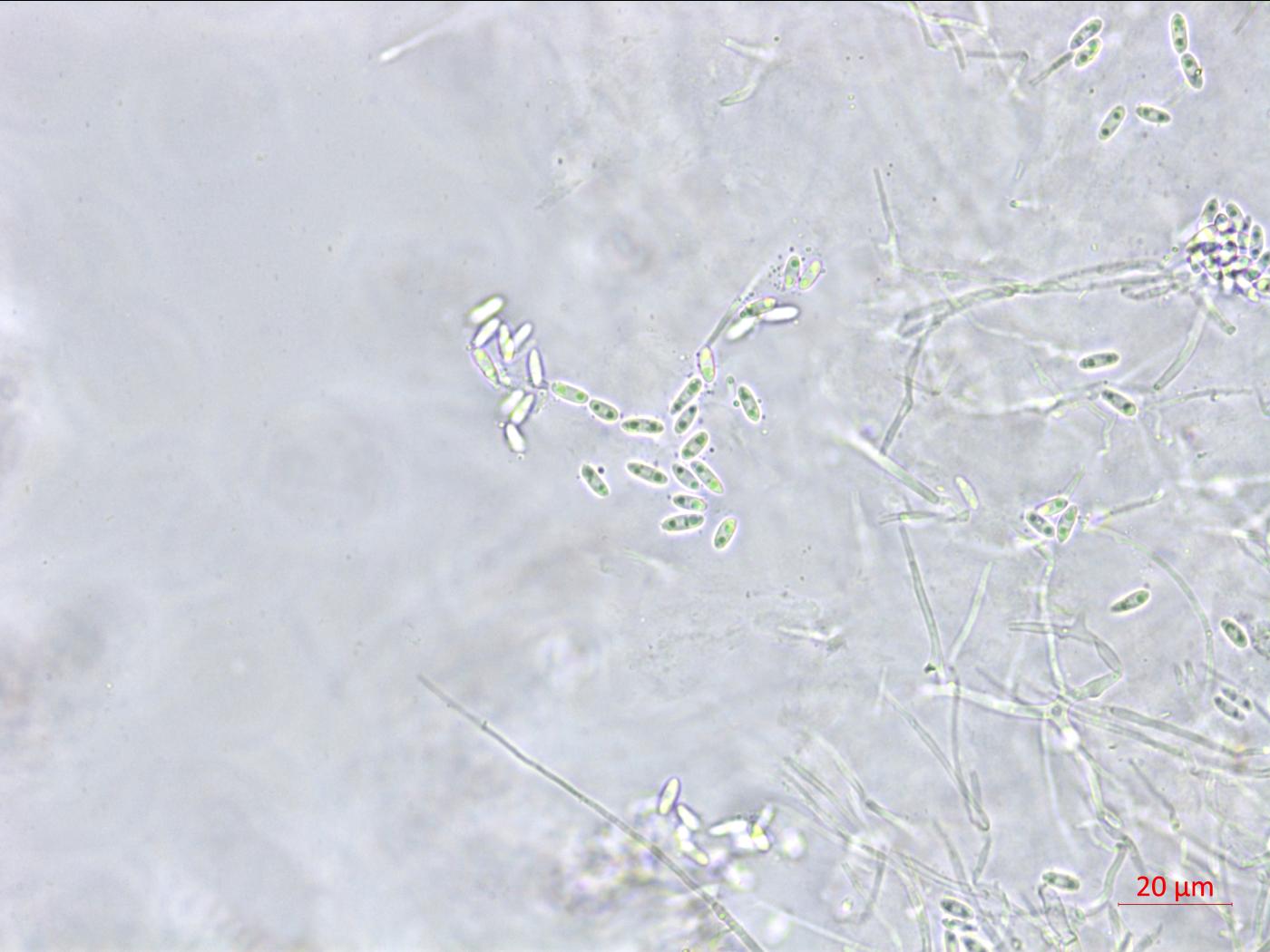 (2) Conidies bêta (β) - Longues et minces (filiformes). Avec une courbure caractéristique (ressemblant à un bâton de Hockey). Non septées. Sans guttule.