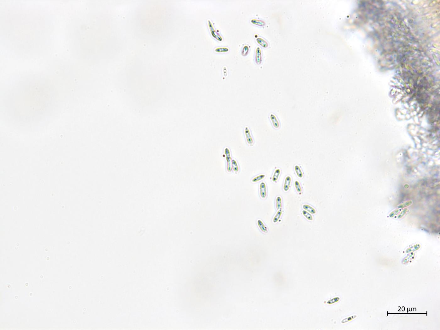 (1) Conidies alpha (α) - Fusiformes, ellipsoïdes, pointues aux apex ou ovoïdes. Non septées. Guttulées (avec plusieurs guttules ou uniquement une guttule à chaque extrémité).