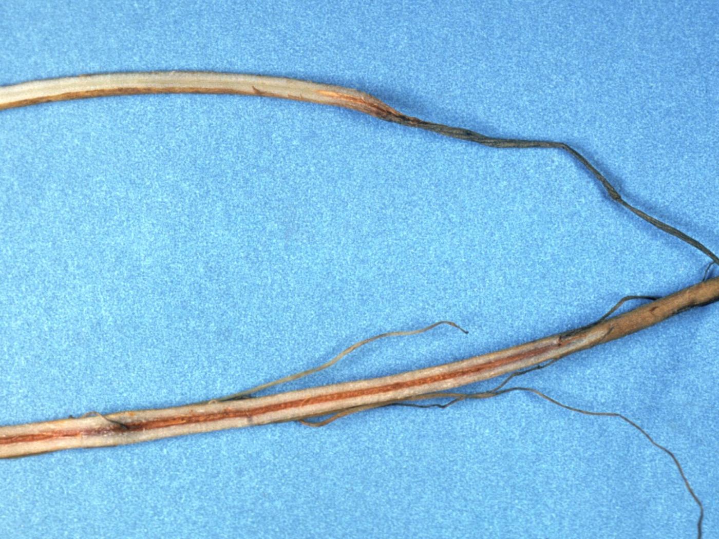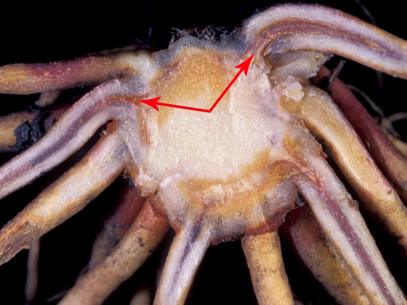 Description: Le système vasculaire et la moelle d’un collet de fraisier sont rougeâtres à brunâtres tandis que la stèle des racines est rougeâtre (voir flèches). Chez le fraisier, ces symptômes sont caractéristiques de la stèle rouge causée par Phytophthora fragariae var. fragariae. Lorsque le collet est atteint comme dans ce cas-ci, le plant est très affecté par la maladie.
