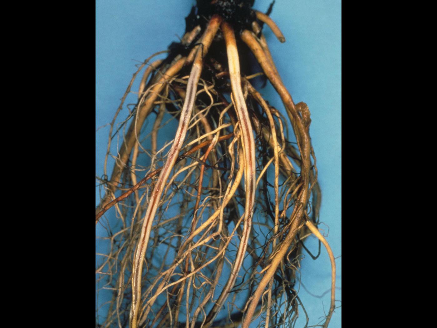 Racine : coloration rougeâtre, pourpre ou brunâtre de la stèle. Les racines principales présentent une pourriture brune à noire débutant à l’extrémité et ont une apparence de « queue-de-rat » étant donné la destruction complète des radicelles.