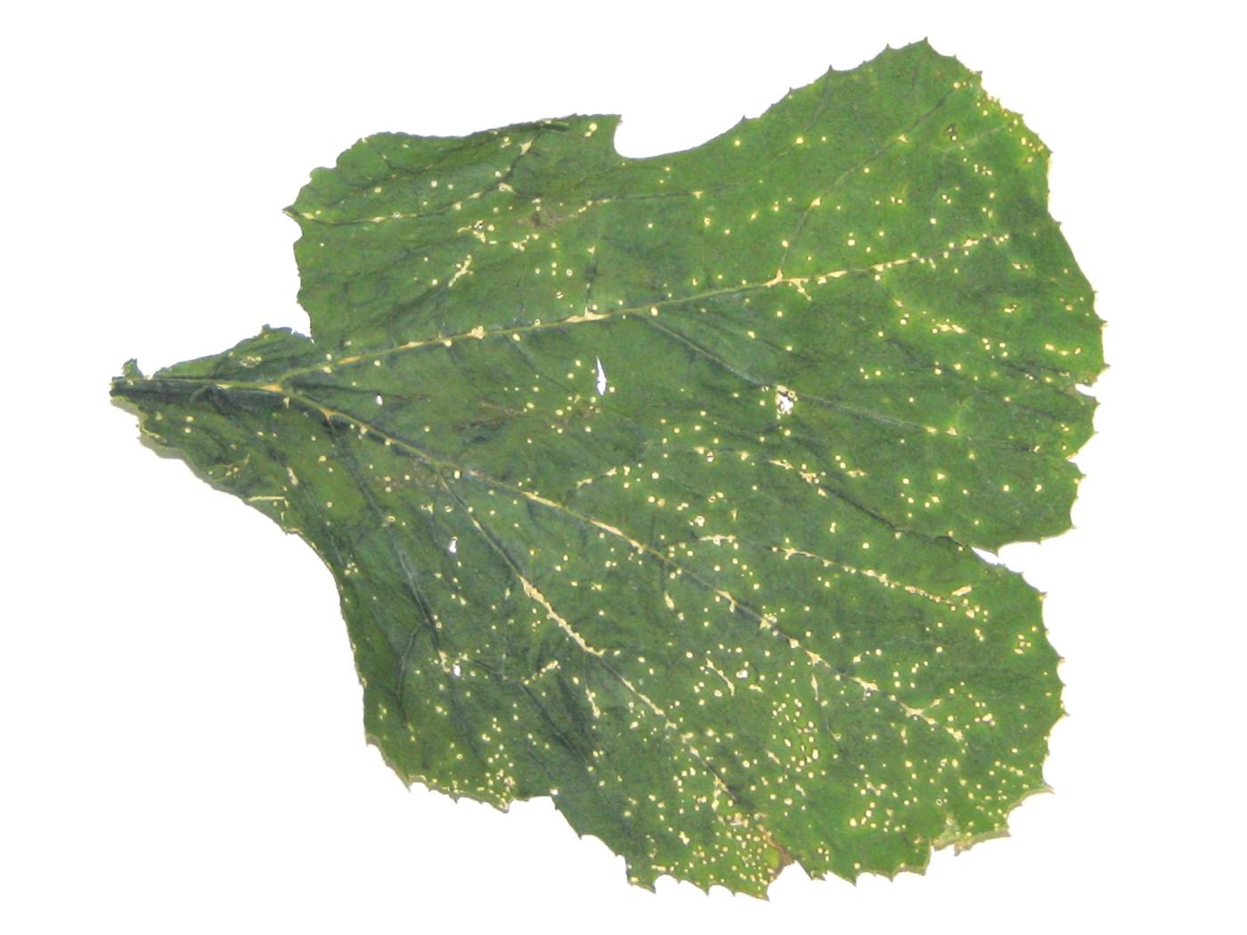 Feuille : présence de petites taches circulaires blanchâtres de 1 à 3 mm, s’apparentant à un fin picotement. Les taches se regroupent pour former des plages blanchâtres d’aspect sec. Sur les pétioles et les nervures, les lésions prennent la forme de lentilles ou de losanges. À un stade plus avancé, les pétioles virent au blanc et le feuillage meurt.