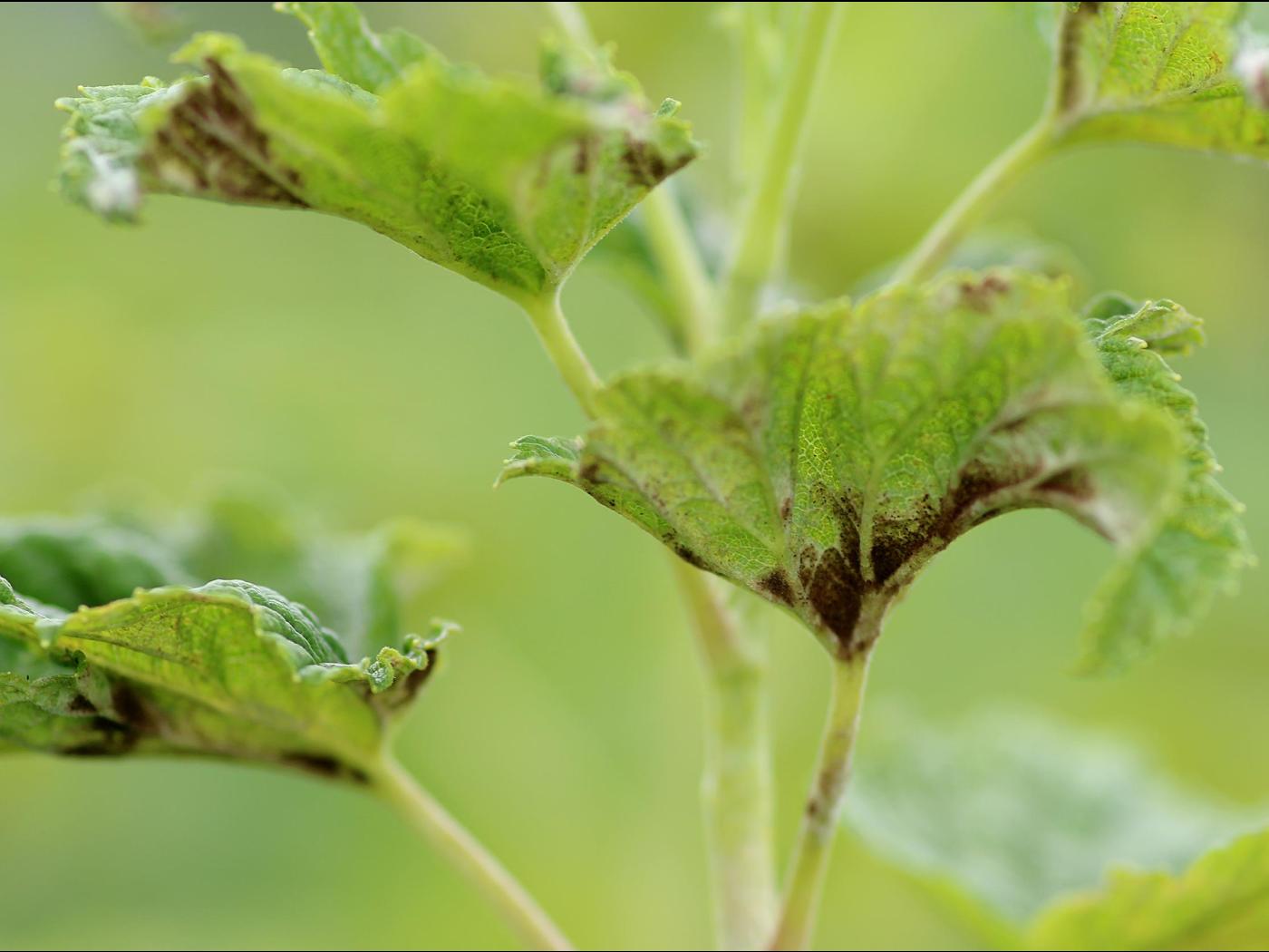 Description: Face inférieure d’une feuille de cassis démontrant des symptômes de l’oïdium brun. Le duvet blanc longe les nervures et le limbe brunit par endroits.