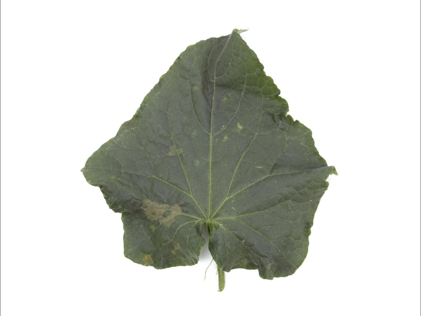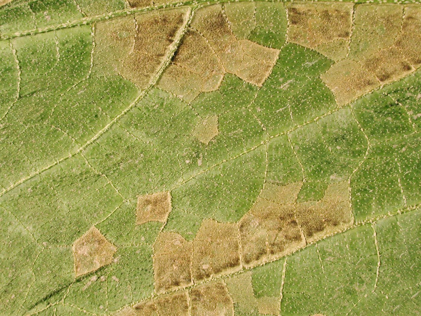 Feuille : à la face supérieure, les taches sont initialement jaunes et angulaires, puis deviennent brunes et peuvent former de larges plages brunes qui finissent par faire mourir les feuilles. À la face inférieure, les taches sont brunes et se couvrent de sporanges de P. cubensis, conférant une teinte brun-violacé au limbe. Les infections débutent toujours sur les vieilles feuilles et progressent vers les jeunes feuilles.