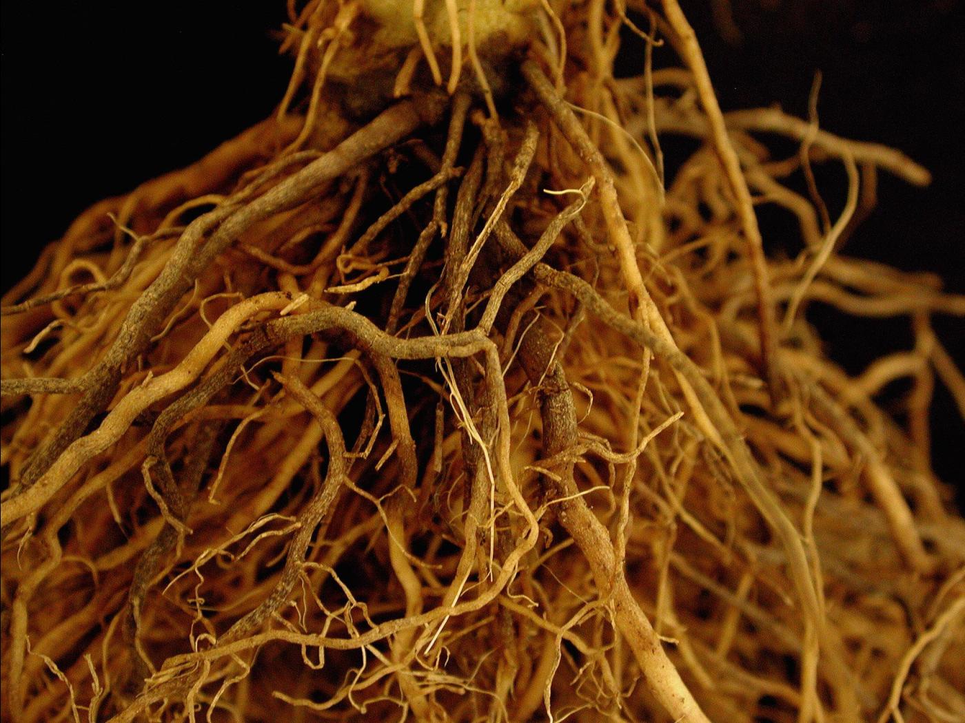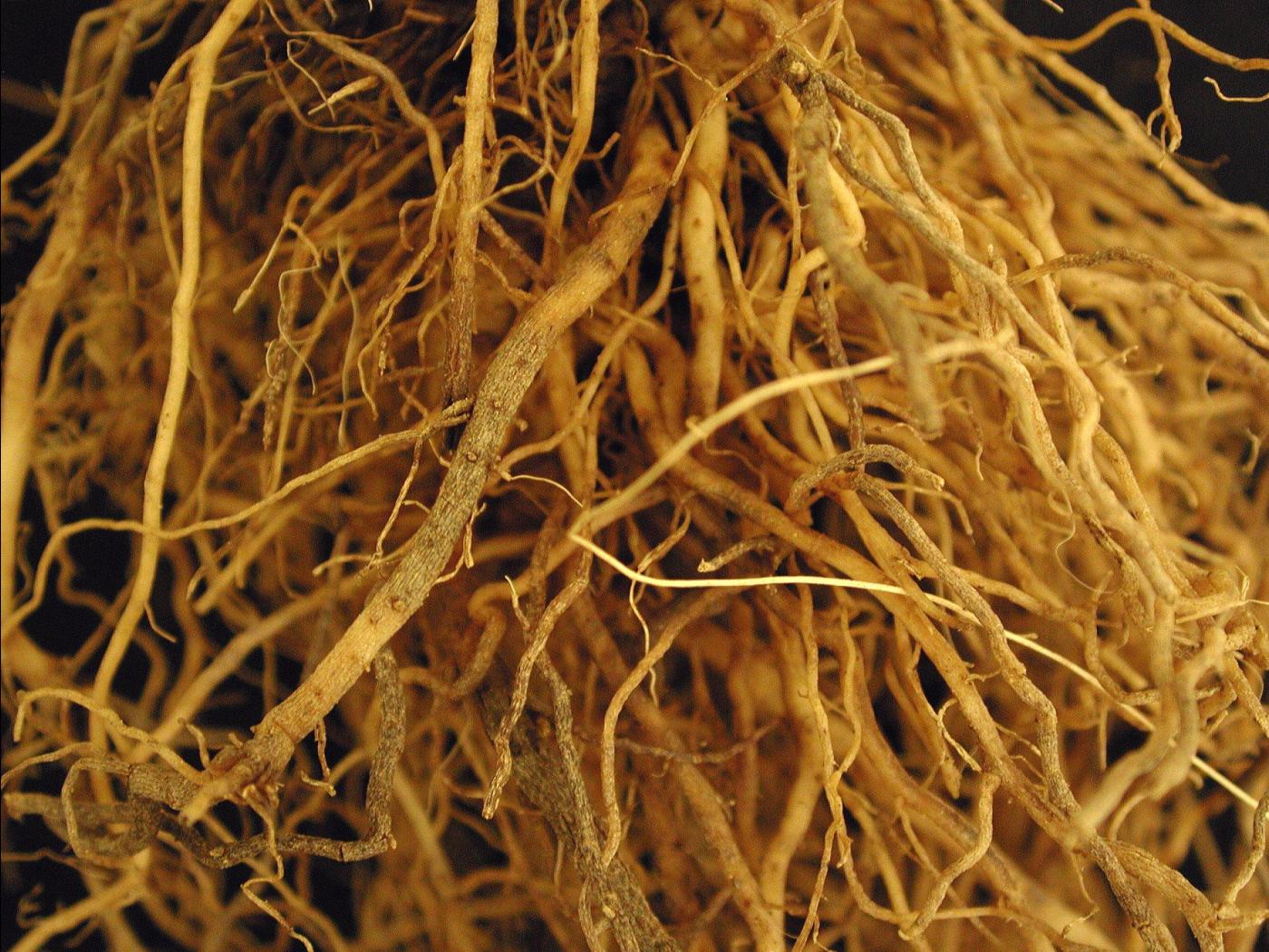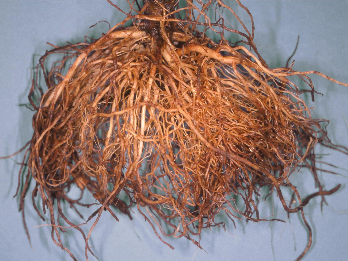 Description: Le système racinaire d’un plant de tomate de serre montre des racines renflées, brunes et liégeuses, dont l’épiderme se détache facilement. Les observations microscopiques ont révélé la présence du champignon Pyrenochaeta lycopersici, responsable de la racine liégeuse chez la tomate.