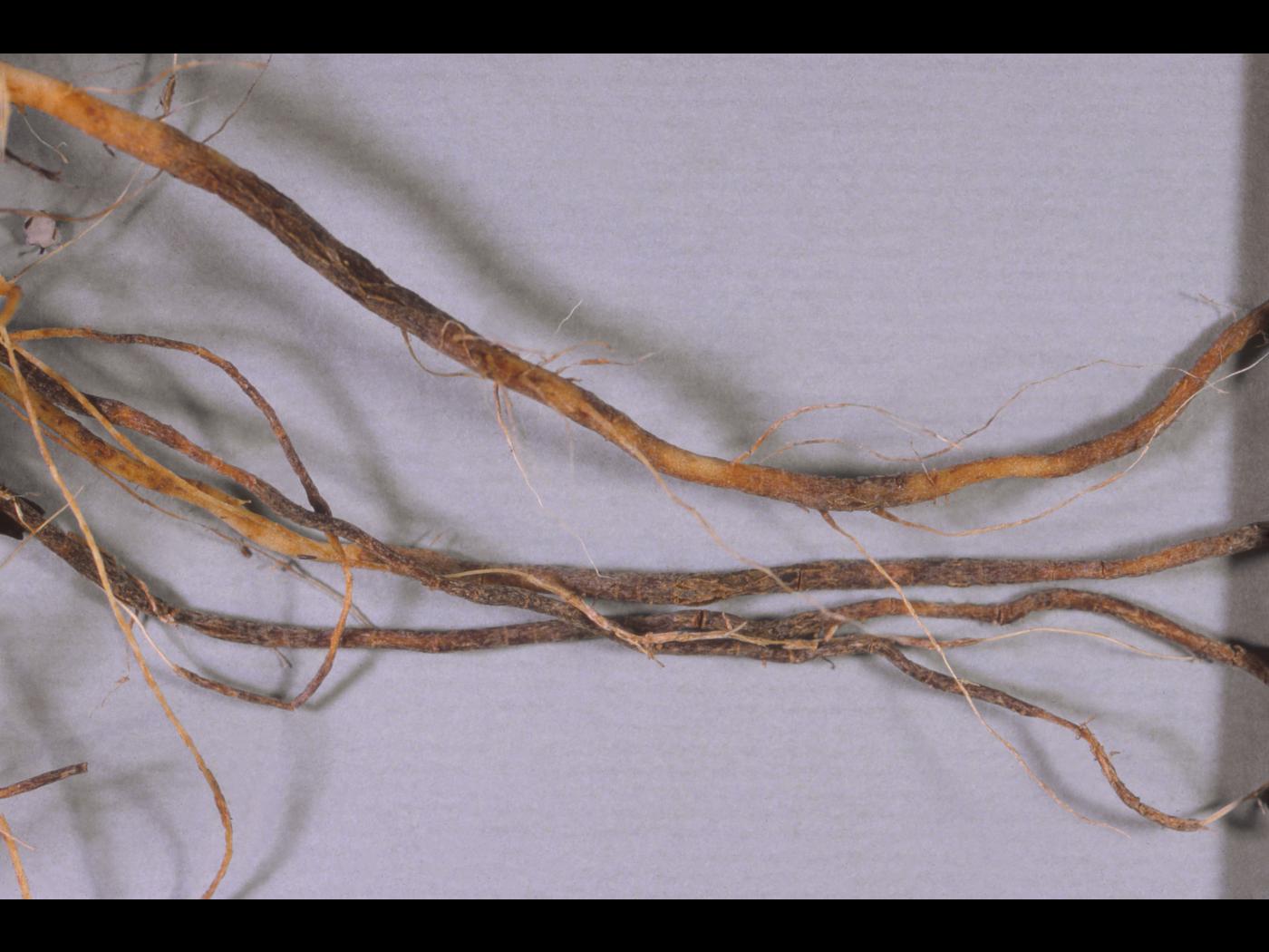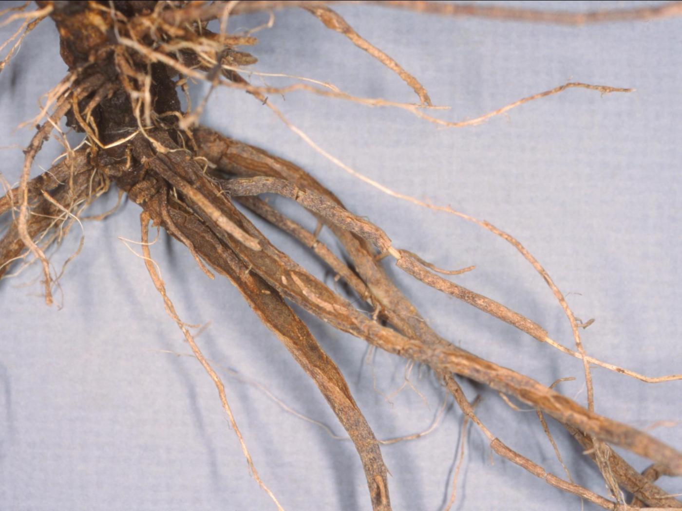 Racine : les radicelles sont infectées en premier et les symptômes se manifestent sous la forme de lésions brun clair d’environ 5 mm de longueur puis d’une pourriture. Les dommages sont appelés « pourriture brune ». Sur les grosses racines, les lésions sont nombreuses, brunes, renflées dont certaines évoluent en un manchon liégeux sec. Des craquelures sont parfois observées sur l’épiderme. Le cortex se sépare facilement de la stèle et prend la forme de « queue-de-rat ». Lorsque le mycélium remplit les cellules racinaires de l’hôte, des microsclérotes rectangulaires caractéristiques de la maladie sont formés. Le volume racinaire est réduit.