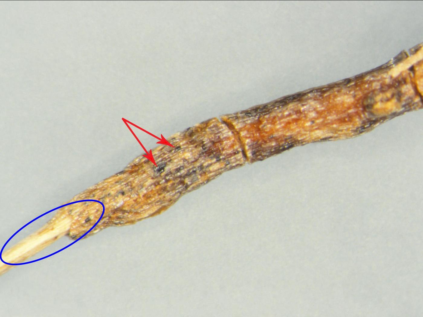 Tige : lors d’infections sévères, présence de lésions corticales brun foncé à la base.