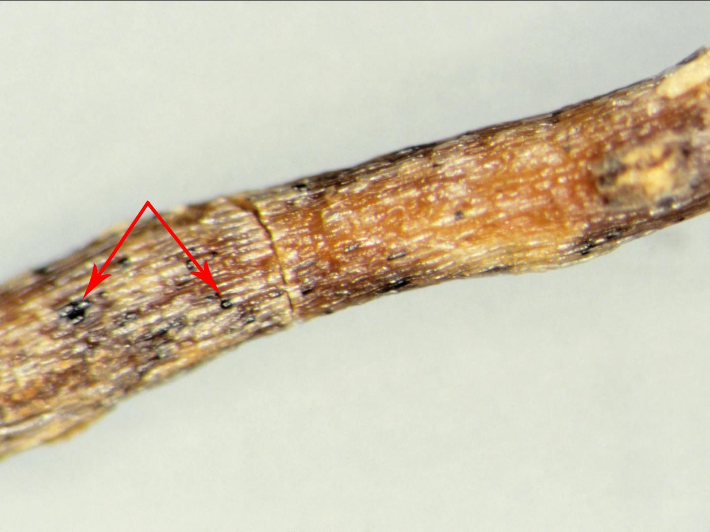 Description: Une vue rapprochée d’une racine d’un plant de tomate de serre montre des microsclérotes rectangulaires noirs (voir flèches) du champignon directement sur l’épiderme. La racine est renflée, brune et liégeuse. Les observations microscopiques ont révélé la présence du champignon Pyrenochaeta lycopersici, responsable de la racine liégeuse chez la tomate.