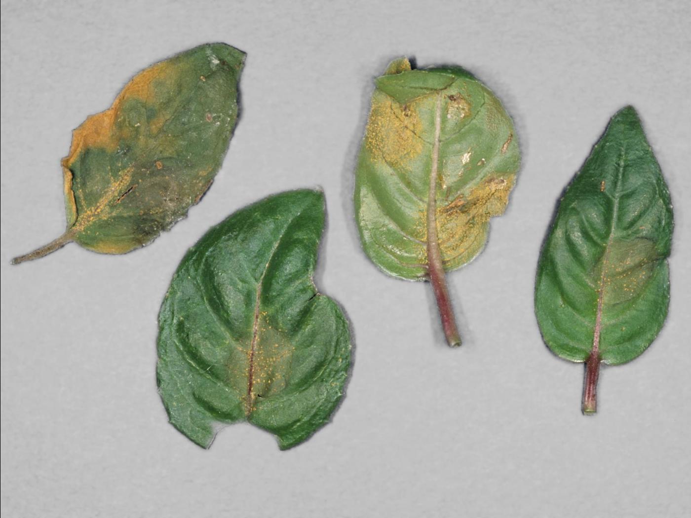 Feuille : à la face supérieure, présence de grandes taches circulaires jaune pâle. Des zones vert foncé sont parfois observées sur les taches jaunes. Sur certains cultivars, les taches deviennent bronzées avec une marge violette. À la face inférieure, présence de petites taches jaunes qui se couvrent de pustules (urédies) jaune orangé contenant des urédospores. Lorsque la maladie s'aggrave, les spores apparaissent sur les deux faces de la feuille et les taches sont diffuses. Des spores se forment à l’occasion le long des nervures. Lors d’une infection sévère, les feuilles jaunissent, se ratatinent et chutent prématurément. Les plants affaiblis par une défoliation peuvent mourir.