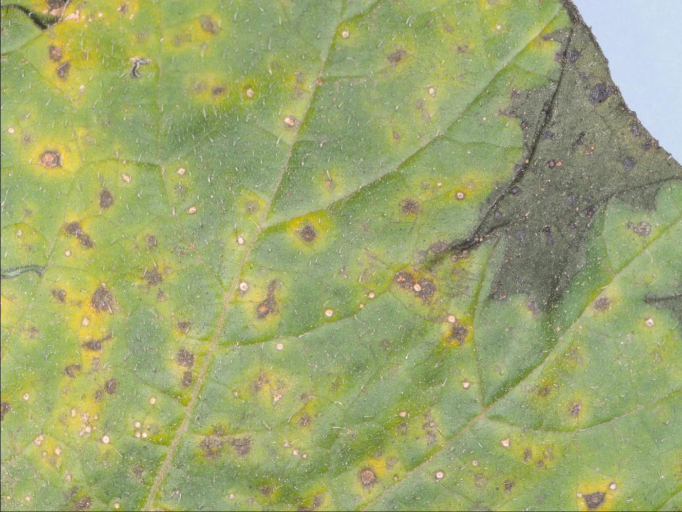 Feuille : sous des conditions humides, les taches ou lésions sont petites, brun foncé, humides et mesurent 1 à 2 mm de diamètre. Sous des conditions sèches, elles sont circulaires ou irrégulières, beiges à blanchâtres et bordées d’une marge foncée. Les taches ou lésions peuvent fendre. Sur les vieilles lésions, des pycnides noires sont également visibles. Sur les melons, la citrouille et les courges d’hiver, les lésions sont généralement très abondantes sur les feuilles.