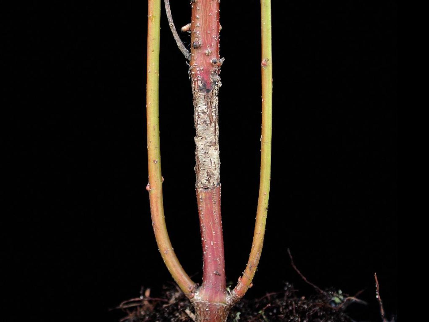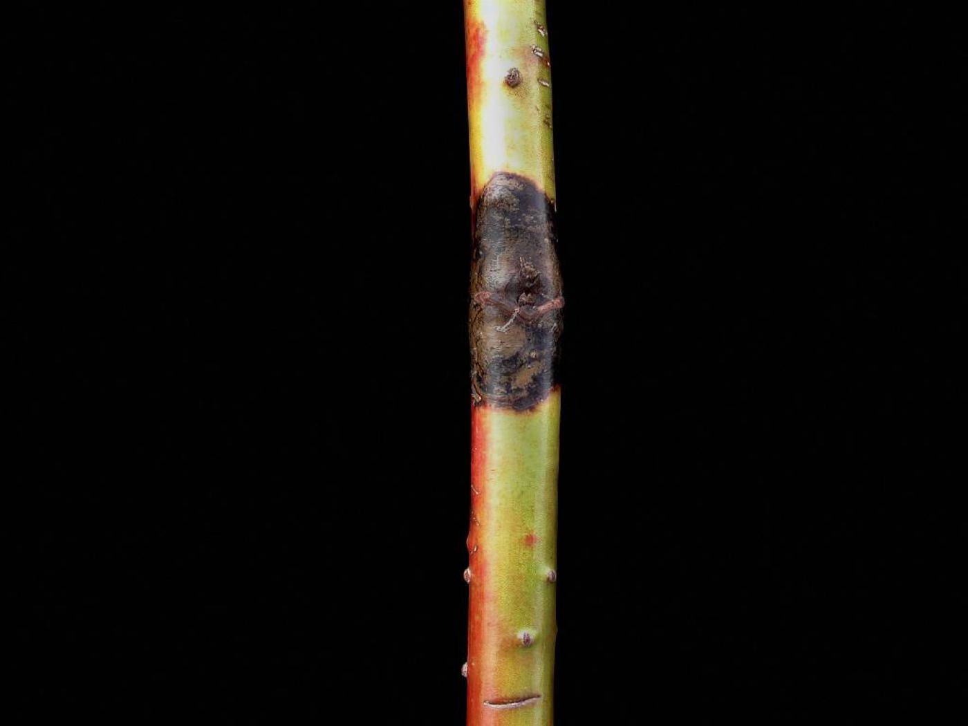 Tige : présence de chancres bruns à noirs, superficiels et qui encerclent partiellement ou totalement la tige. Une bordure rouge délimite parfois le chancre sur l’épiderme.