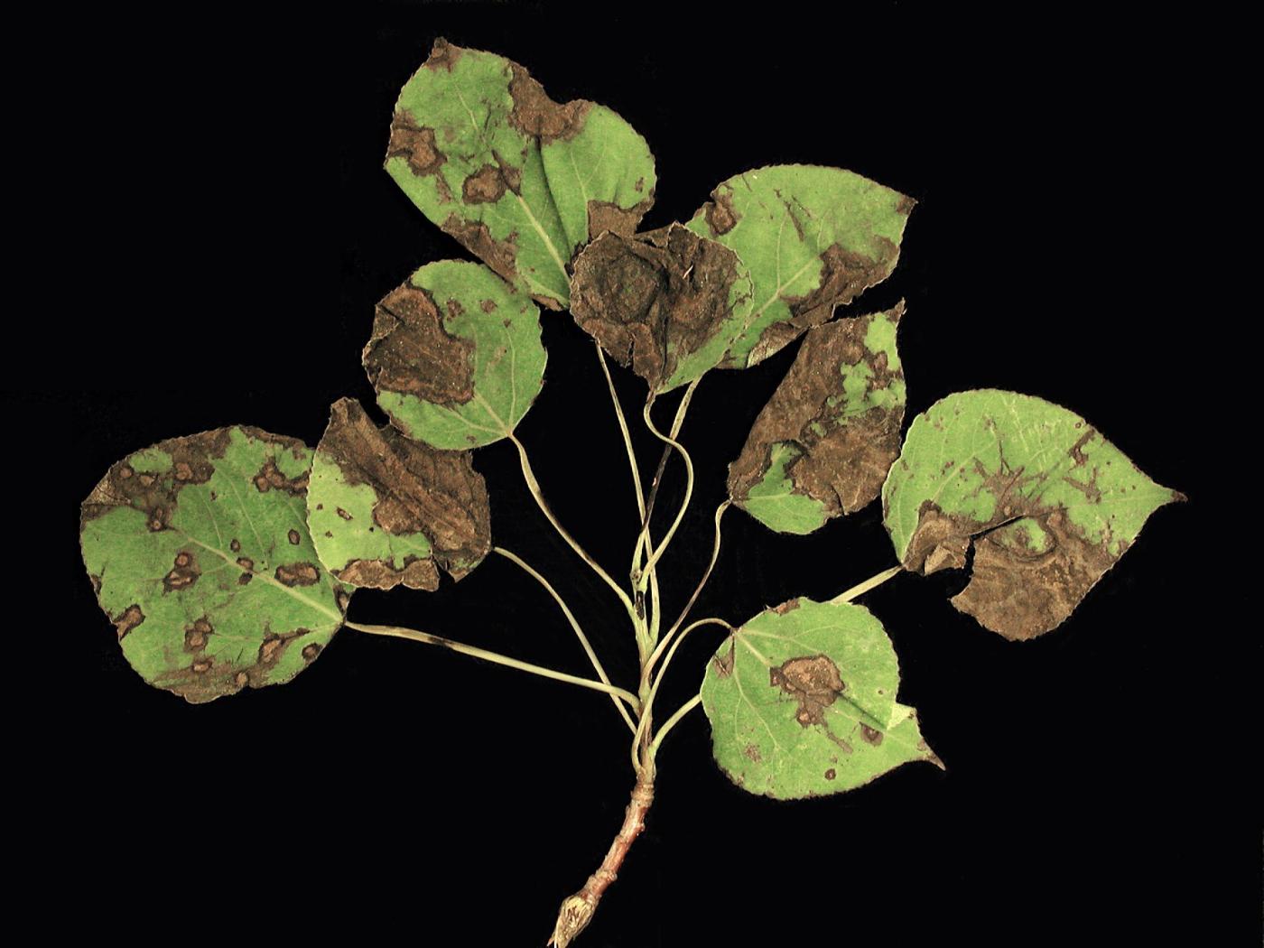 Feuille et pétiole : présence de taches irrégulières brunes à noires qui se transforment en brûlures qui progressent rapidement vers la nervure centrale et les pétioles, causant la mort de la feuille entière et de la pousse. Quelques jours après l’infection, lorsque les conditions sont humides, les feuilles infectées ont une apparence vert olive causée par la sporulation du champignon à la surface des tissus. Défoliation prématurée.