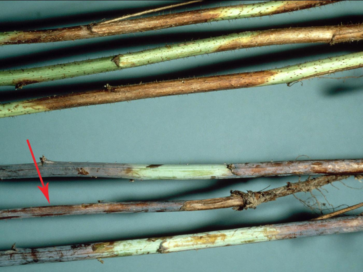 Description: Cette image montre des tiges annuelles de deux cultivars de framboisier. Pour les deux cultivars, l’infection débute aux nœuds et se développe ensuite de part et d’autre du bourgeon. Sur les tiges du haut, l’anomalie de coloration est uniformément brune tandis que sur les tiges du bas, elles sont bleutées. Cette teinte est reliée à la couche de cire plus importante sur les tiges de ce cultivar. Lorsque la cire est enlevée (voir flèche), les tissus sous-jacents sont bruns. Chez le framboisier, ce… En savoir plus