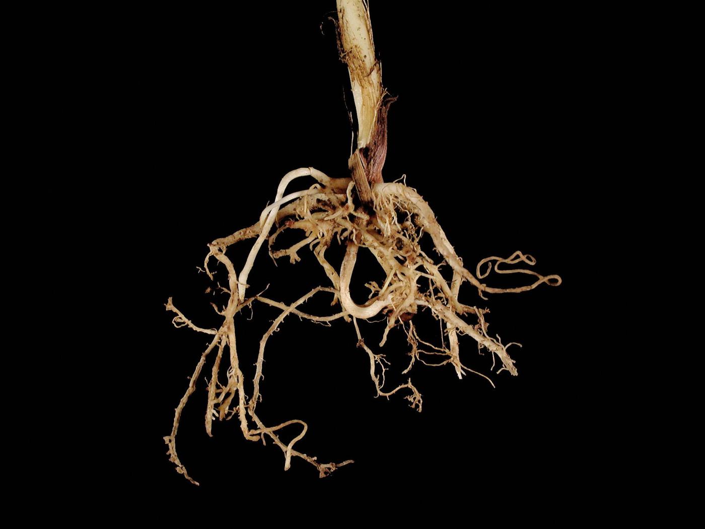 Description: Les racines d’un plant de maïs grain et fourrager sont brunâtres et montrent le développement de longues racines fasciculées dont l'extrémité est renflée. Il y a peu de racines secondaires et de poils absorbants. Les tests de laboratoire ont révélé la présence du nématode aiguille Longidorus sp. dans les racines.