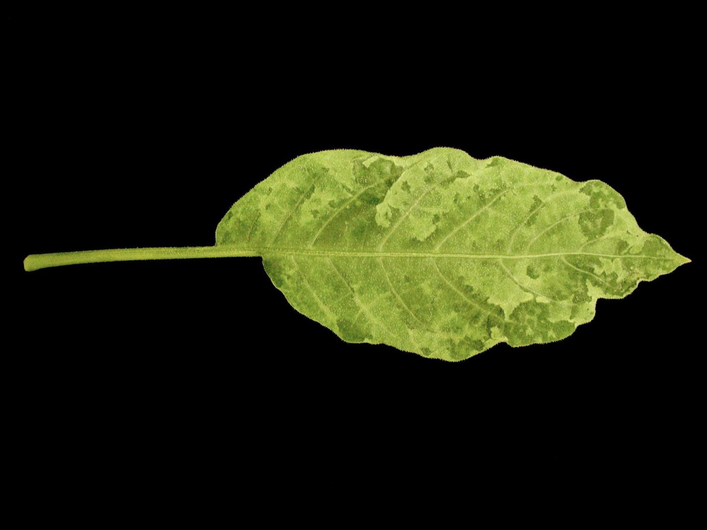Feuille : présence de jaunissement, de mosaïques ou marbrures, de taches jaunes ou en anneaux, d’une décoloration des nervures, de stries en bandes parallèles aux nervures, de nécroses ou de déformations (pustules vert foncé entre les nervures, gaufrage, feuilles enroulées en forme de cuillère, tordues, etc.).
