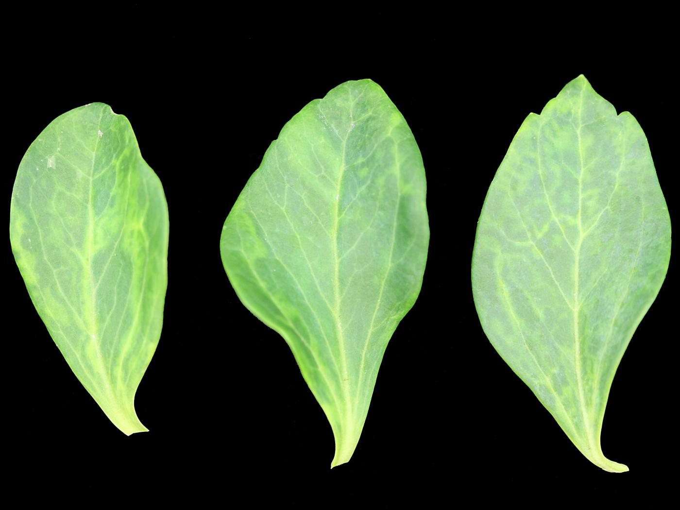 Les symptômes sur les feuilles varient selon la plante, la virulence de la souche du virus, le stade de développement de la plante et les conditions environnementales. Nous présentons les symptômes les plus fréquemment observés.
