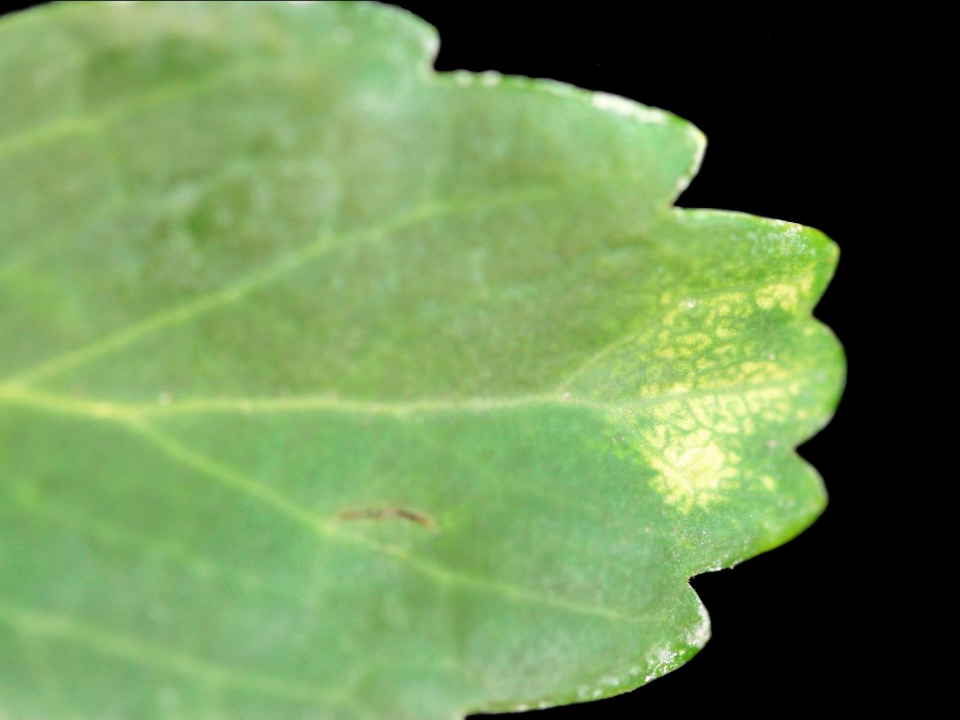 Feuille : sur les jeunes feuilles, présence de mosaïques, de marbrures, de taches jaunes ou blanches, en anneaux ou non, ou d’un jaunissement entre les nervures. Occasionnellement, présence de déformation. Les vieilles feuilles peuvent montrer des taches ou des nervures nécrotiques.